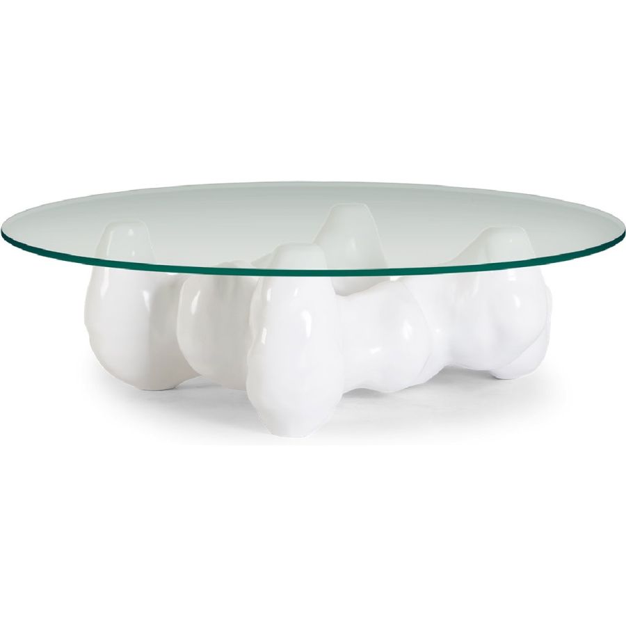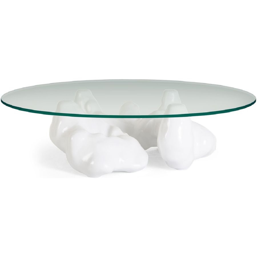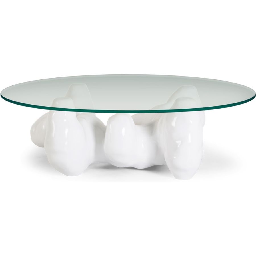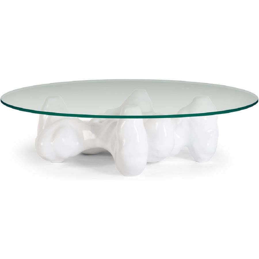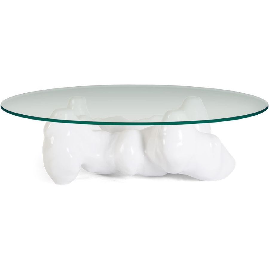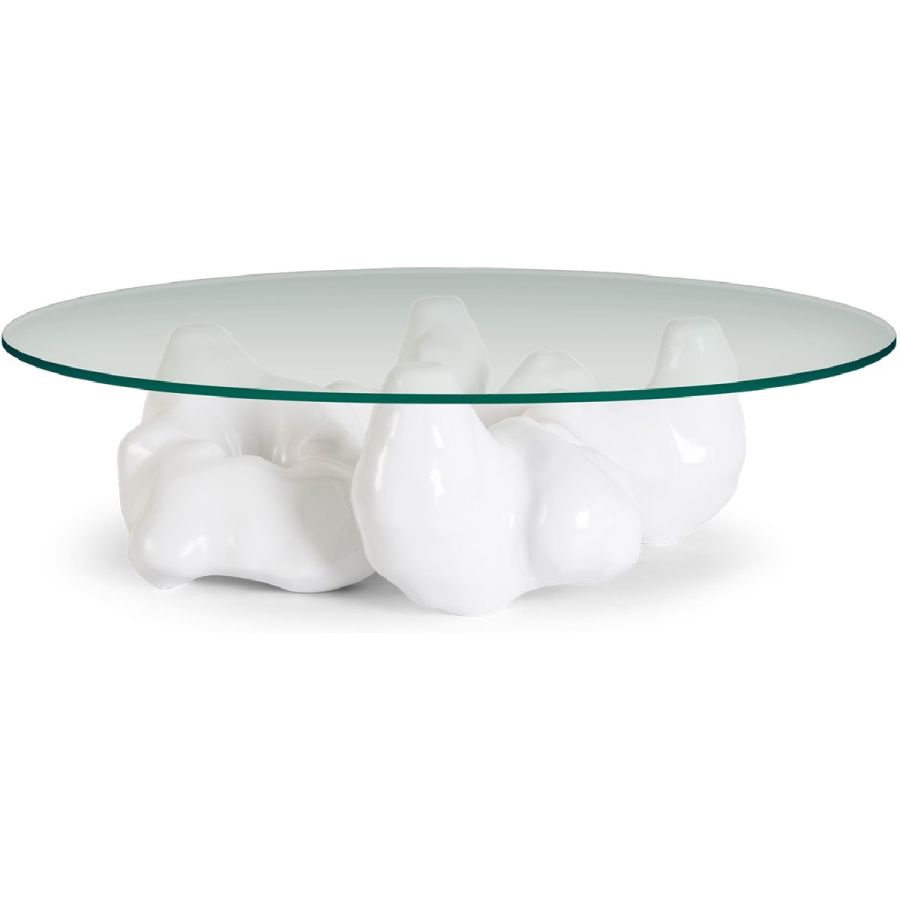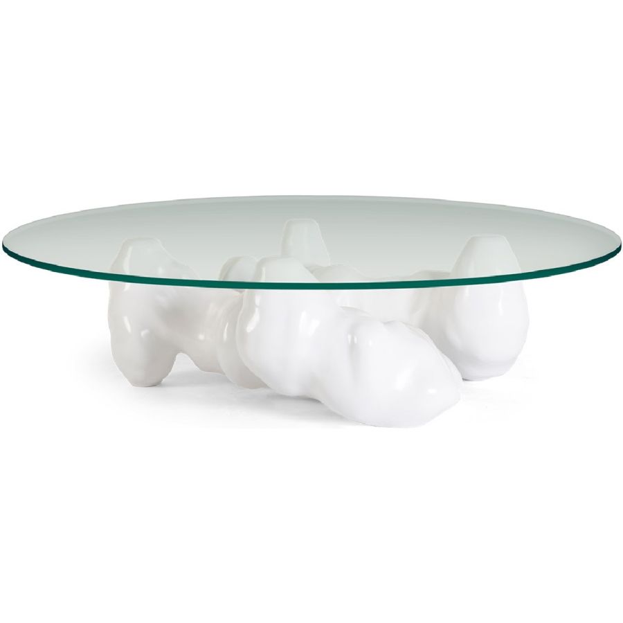 An organic, sculptural resin base inspired by the naturalist sculptures of Rodin is topped with round tempered glass to spectacular effect in this truly unique coffee table.