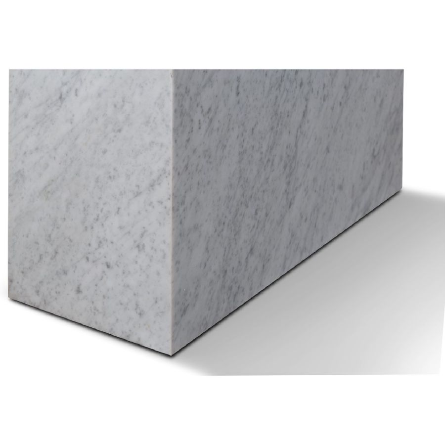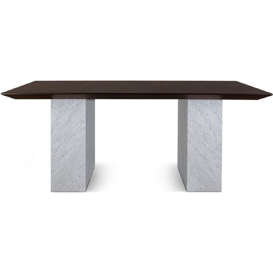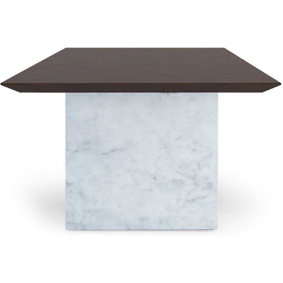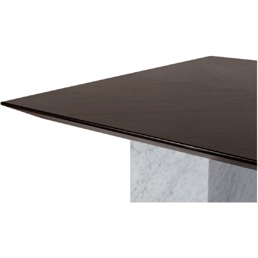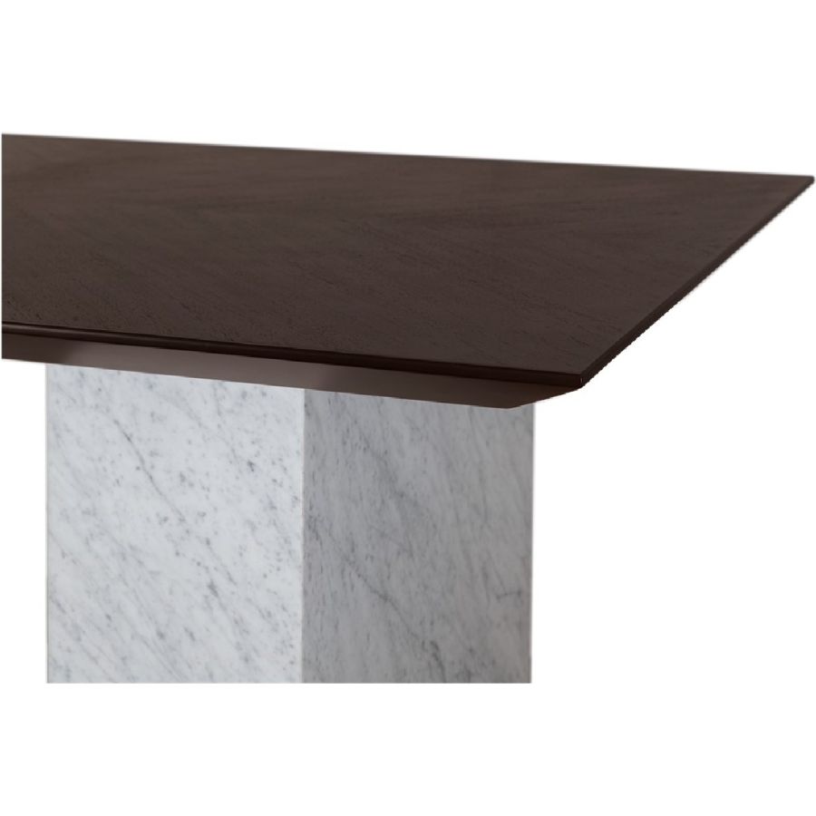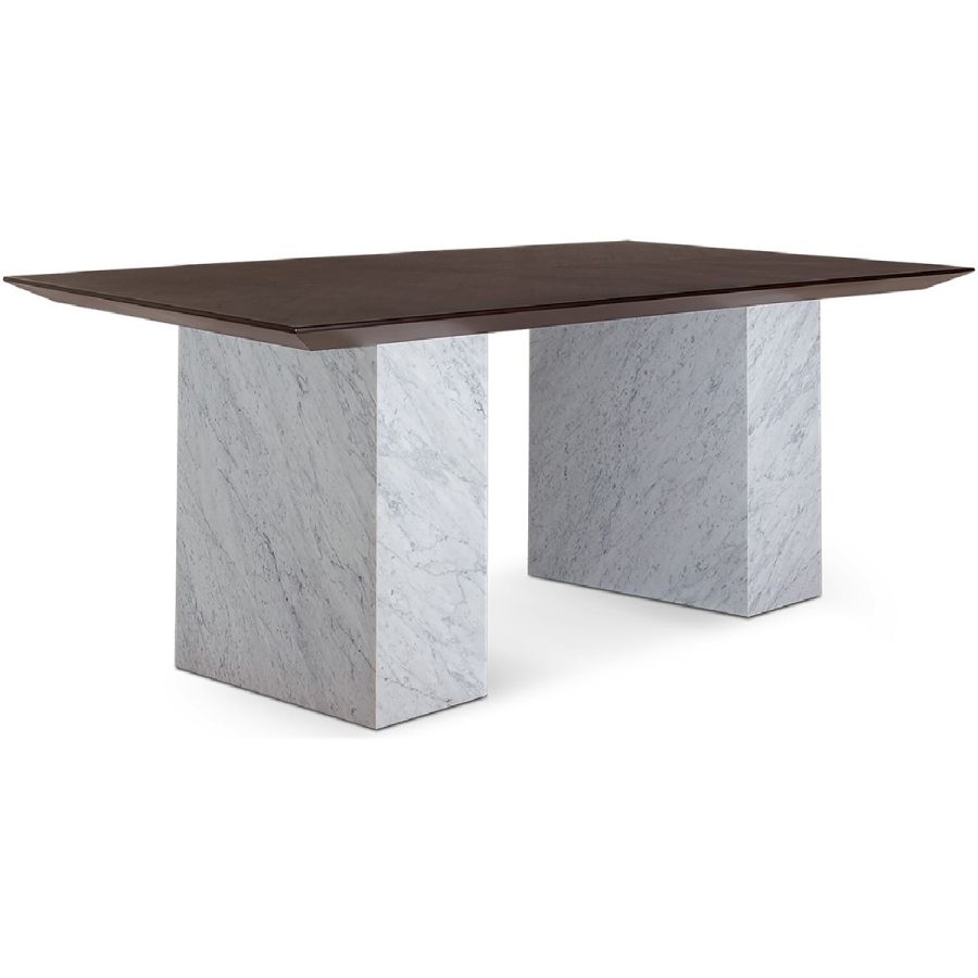 Bring elegance with edge to any dining setting. With smooth slabs of white Carrara marble as bases and a handmade rectangular wood top, this spectacular dining table is a real showstopper!