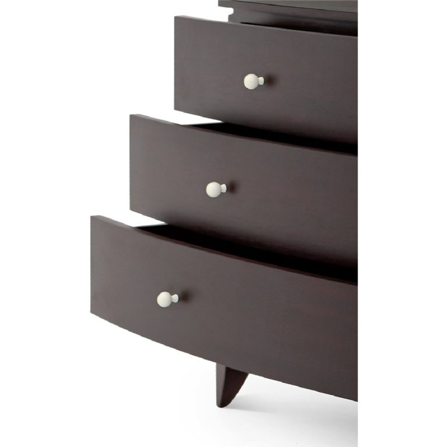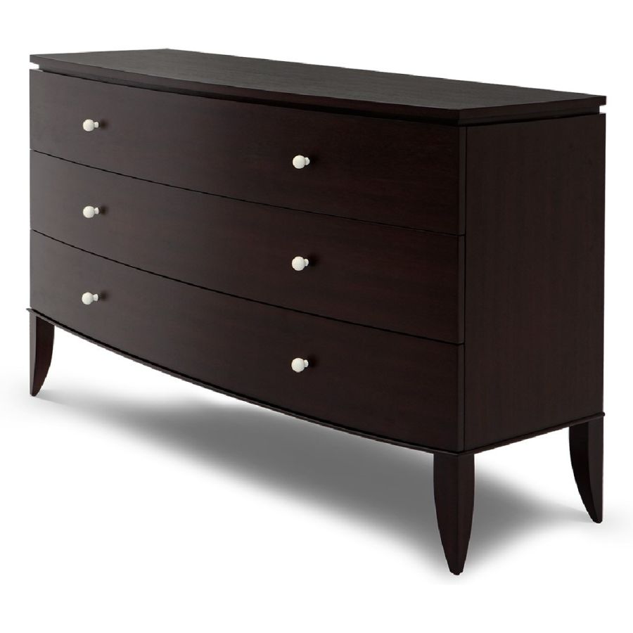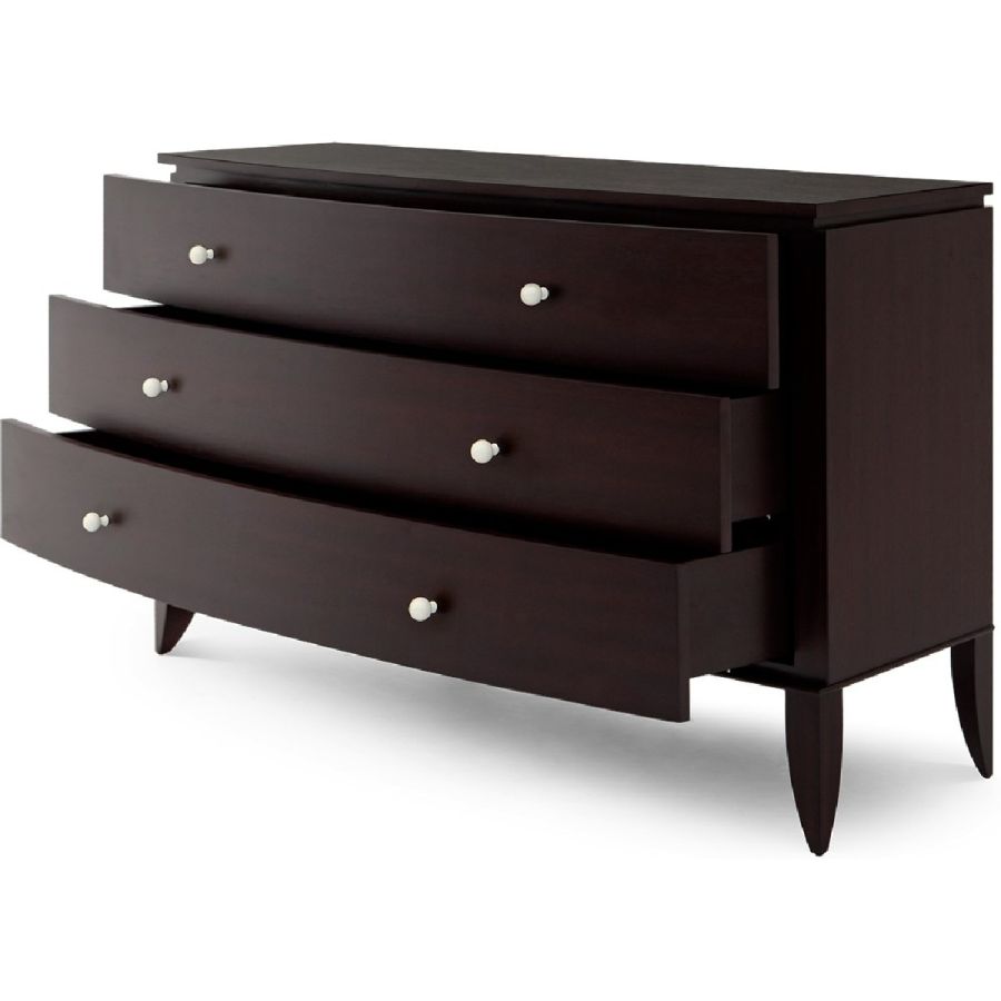 A timeless bow front chest-of-drawers with tapered legs that support the piece with grace and delicate ivoire knobs. The indented edge, which separates the top from the base, adds a fine detail.