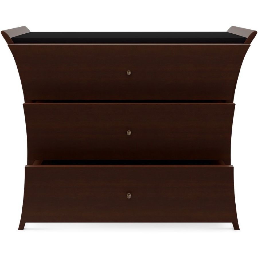 Named after the renowned photographer of the most famous corset image in image history, this delightful hand carved wood chest features curved sides and three drawers with round brass knot feature handles. An elegant and unusual piece perfect for gracing bedrooms and dressing rooms.