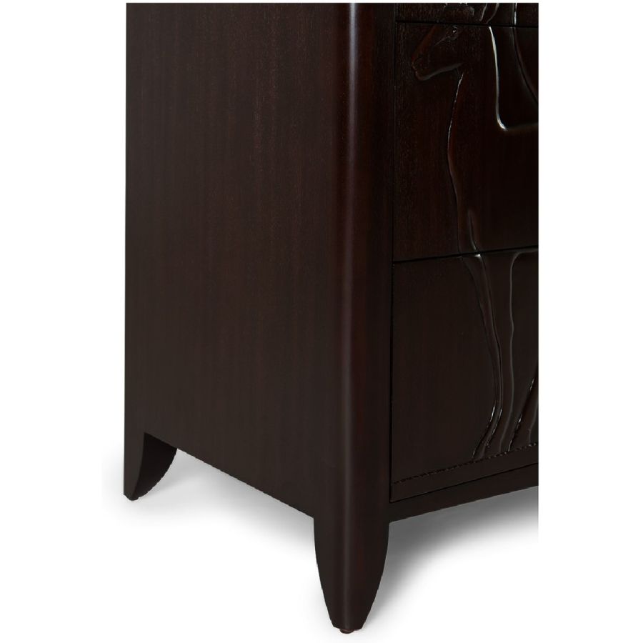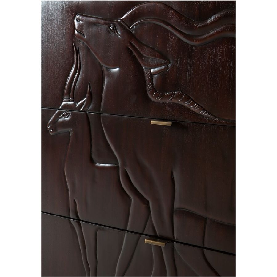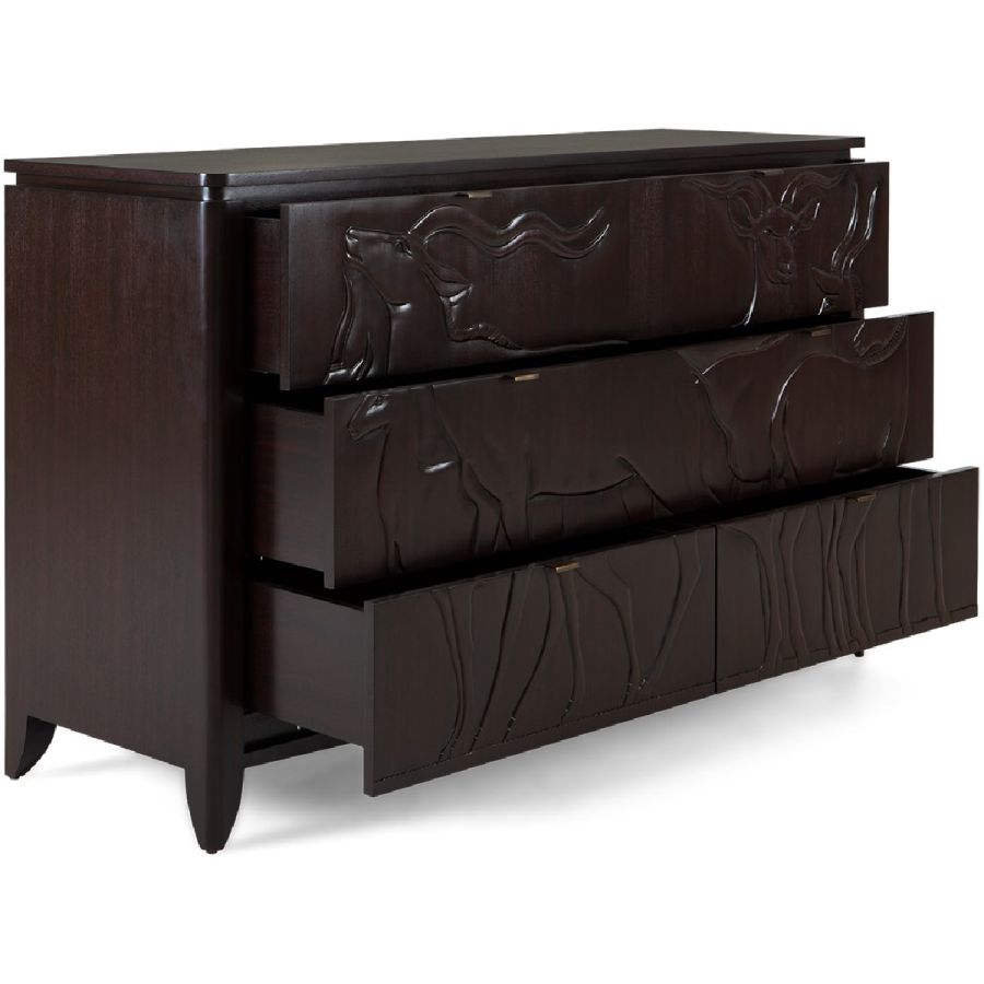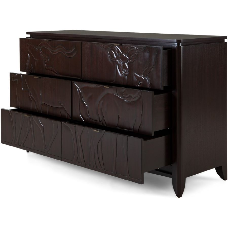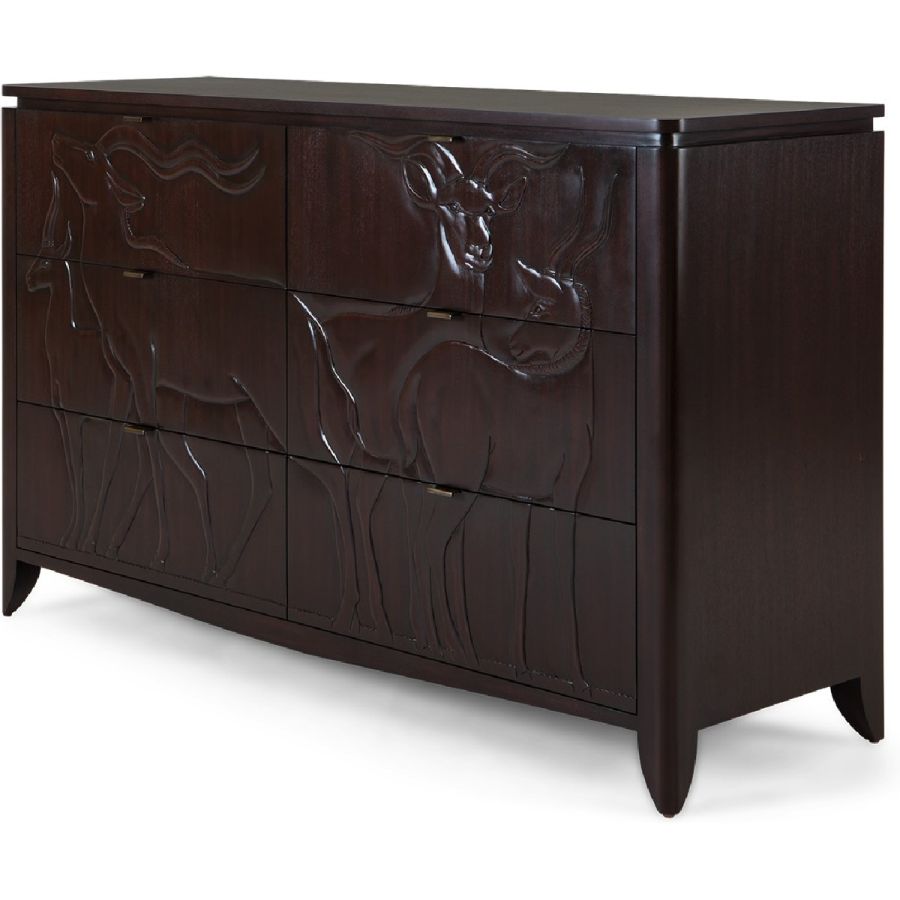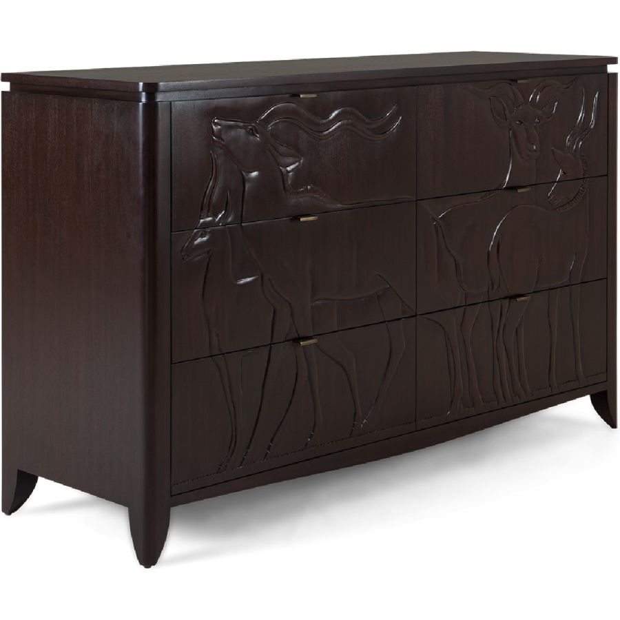 This magnificent chest of 6 drawers, part of the Savanna collection, features hand-carved gazelle scenes based on plaques at the New York Natural History Museum.
