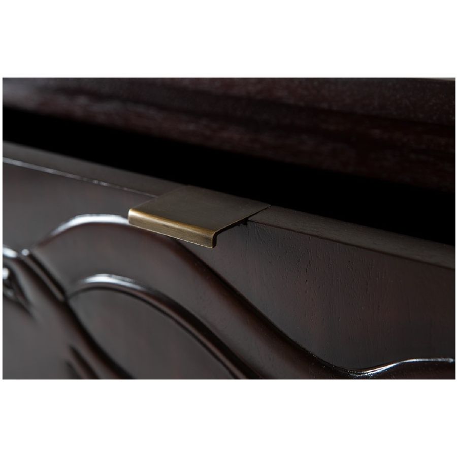 Certified Mahogany hardwood. Hand-Carved reliefs. Veneered Mahogany top. Double ultra-suede lined drawers with easy glide. Multiple Finishing Options. For residential use only. Commercial use is classified as Special Order Design (SOD), and alternative materials may be required.