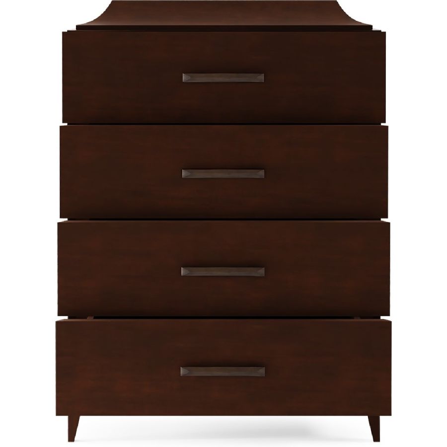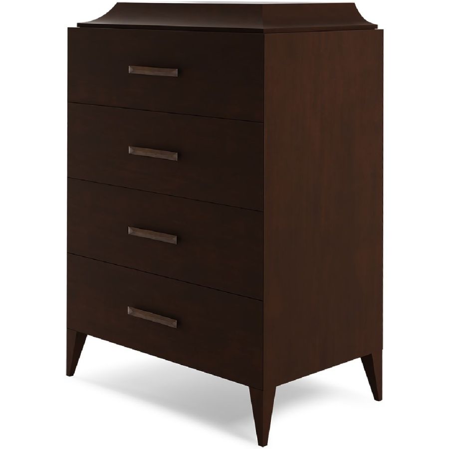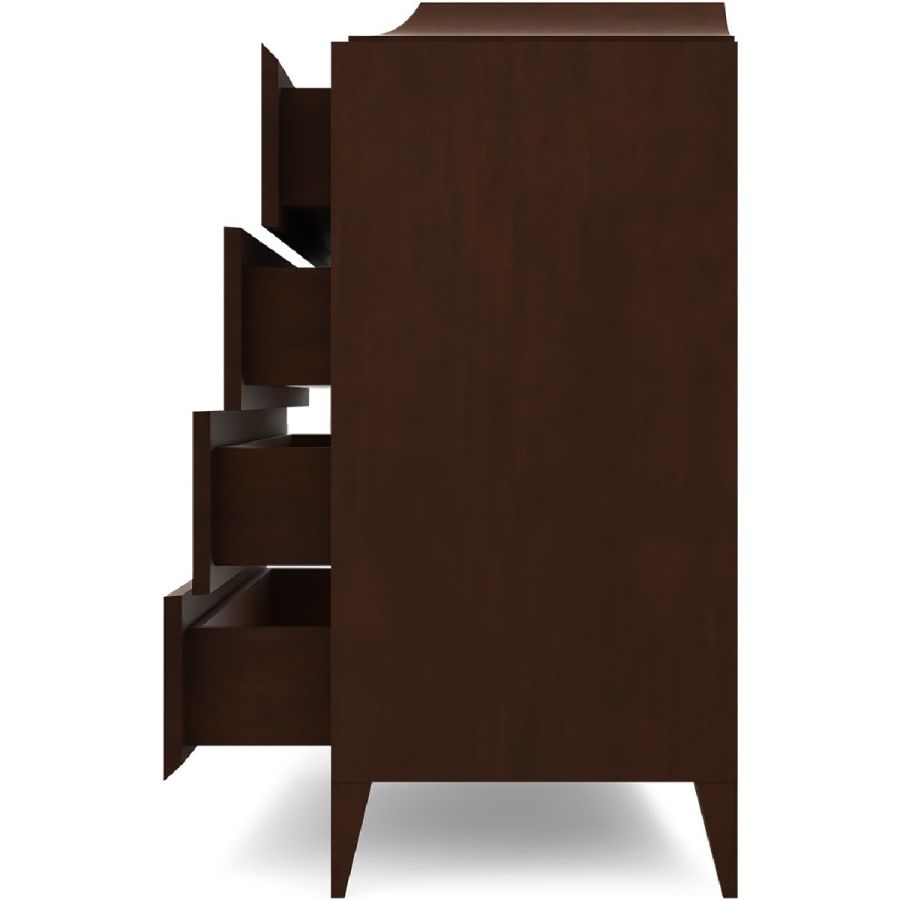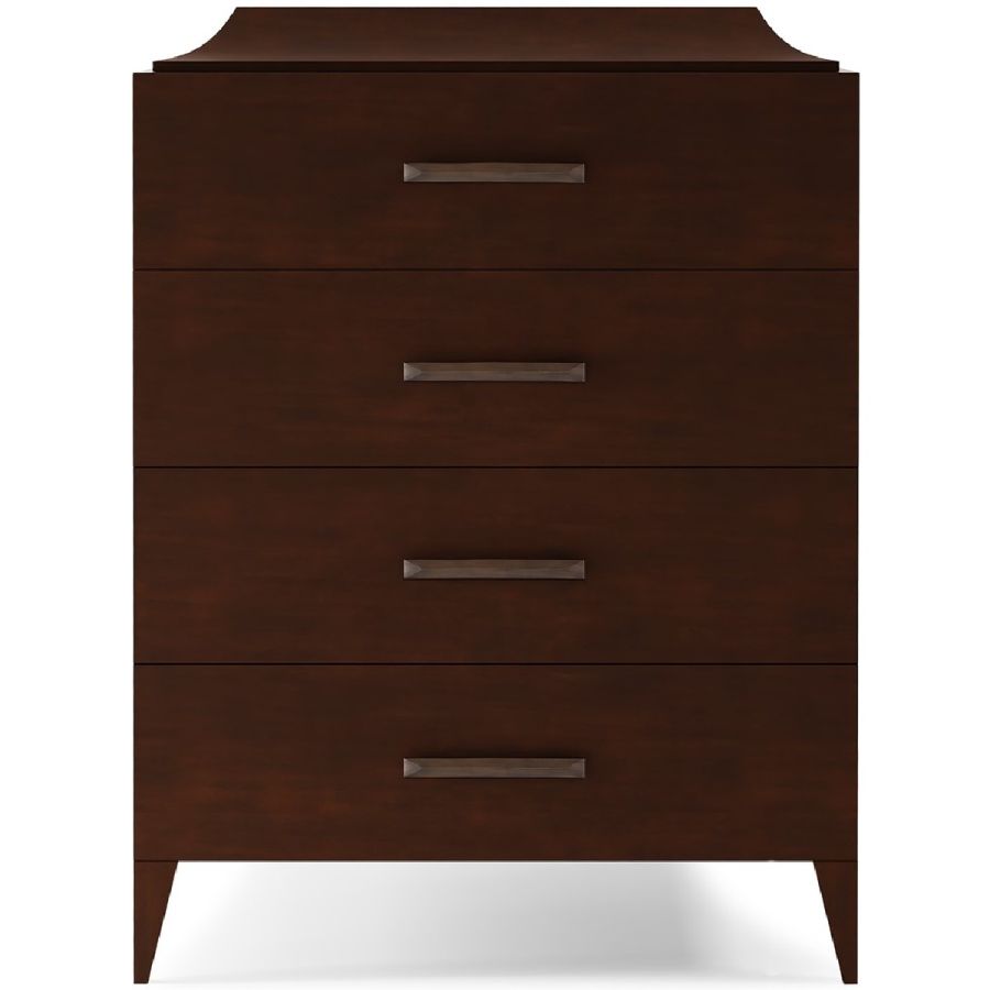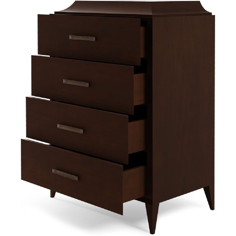 Sophisticated four-drawer chest hand carved from solid wood and with wide bass handles. Includes a drawer concealed in the curved top section. An elegant and adaptable piece for any style of interior.