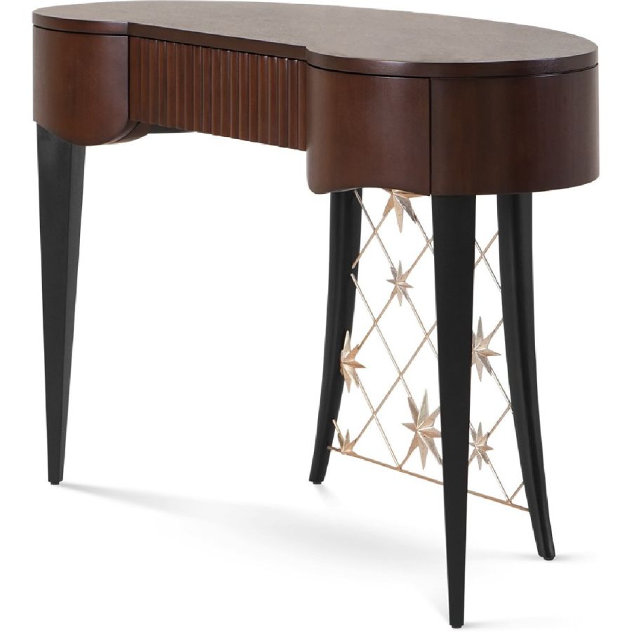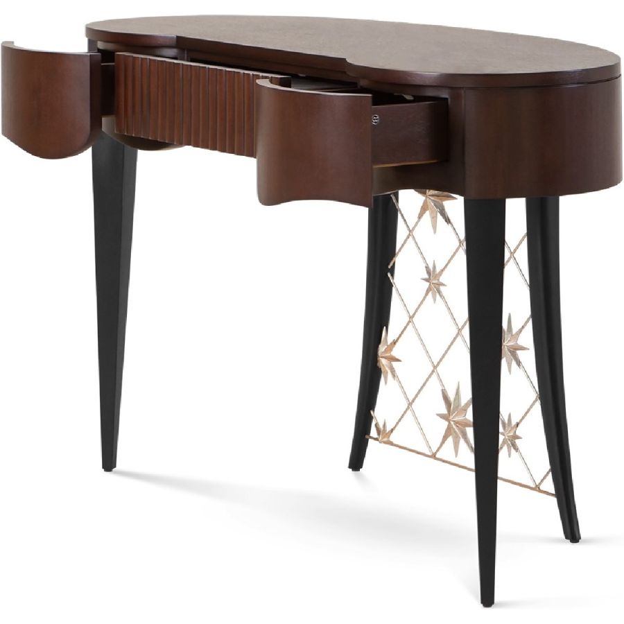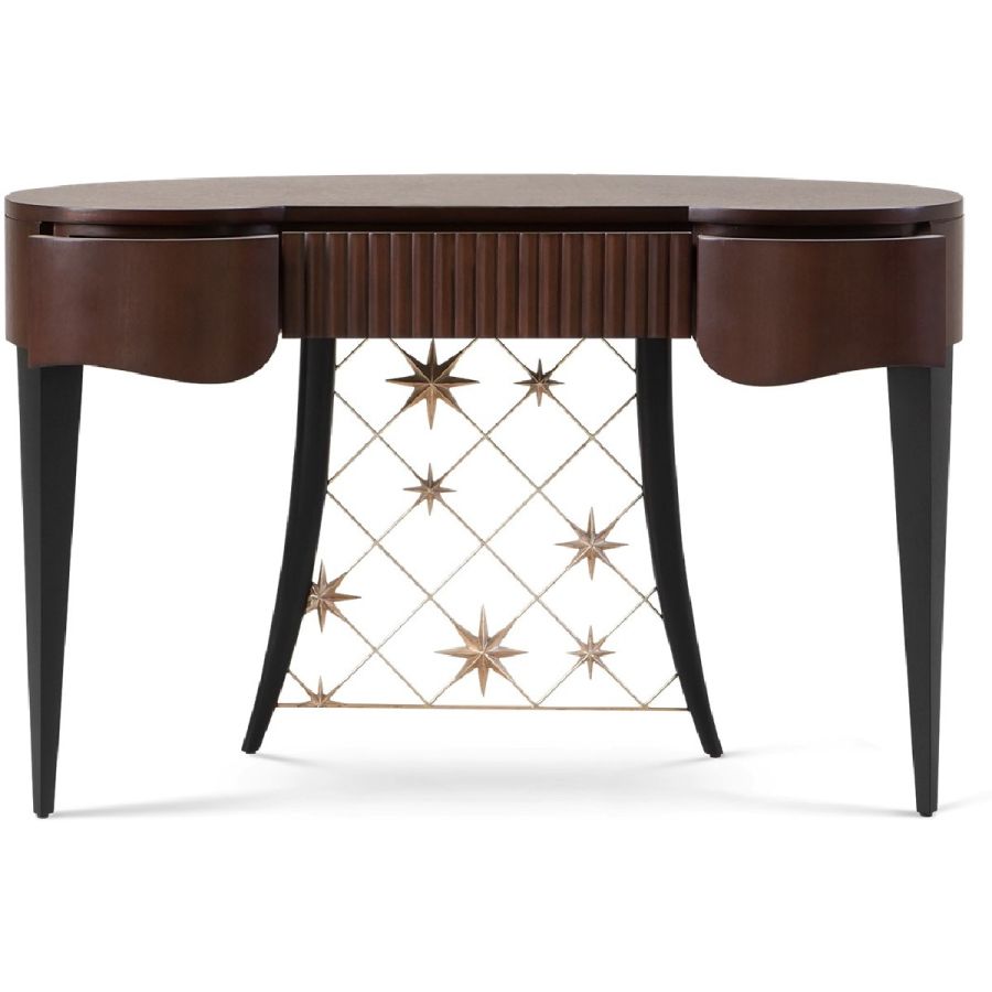 This kidney shaped desk, from the Constellation collection, features hand carved stars on the back gilded diamond metal mesh panel, elegant straight front legs and three practical drawers. A sparkling delight!