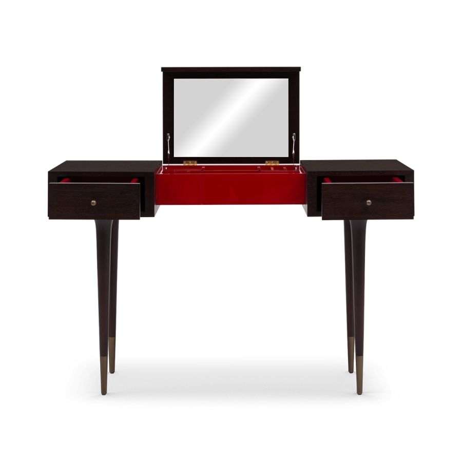 Beautiful dressing table features tapering metal finish tipped legs, crowned by a shallow top fitted with two drawers and a center mirror that cleverly opens to reveal practical compartments. Such elegance!