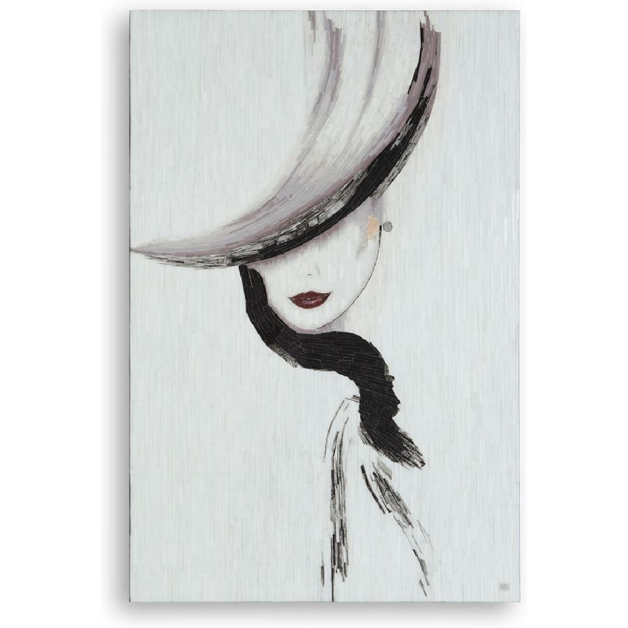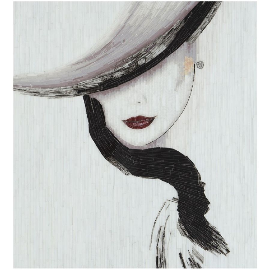 An homage to one of the greats of fashion history, this is a mosaic of consummate grace. Painstakingly created with thousands of hand- cut glass pieces, it displays the mystery and beauty of a gloved lady, her eyes shielded by the sweep of her dramatic hat.