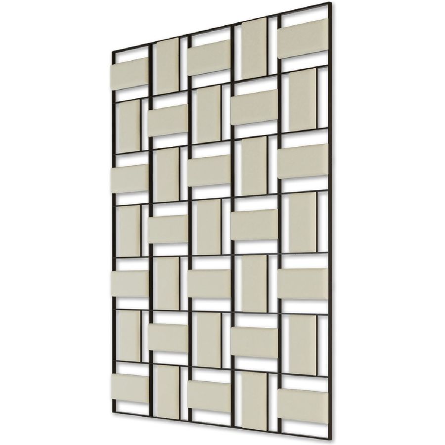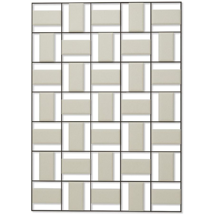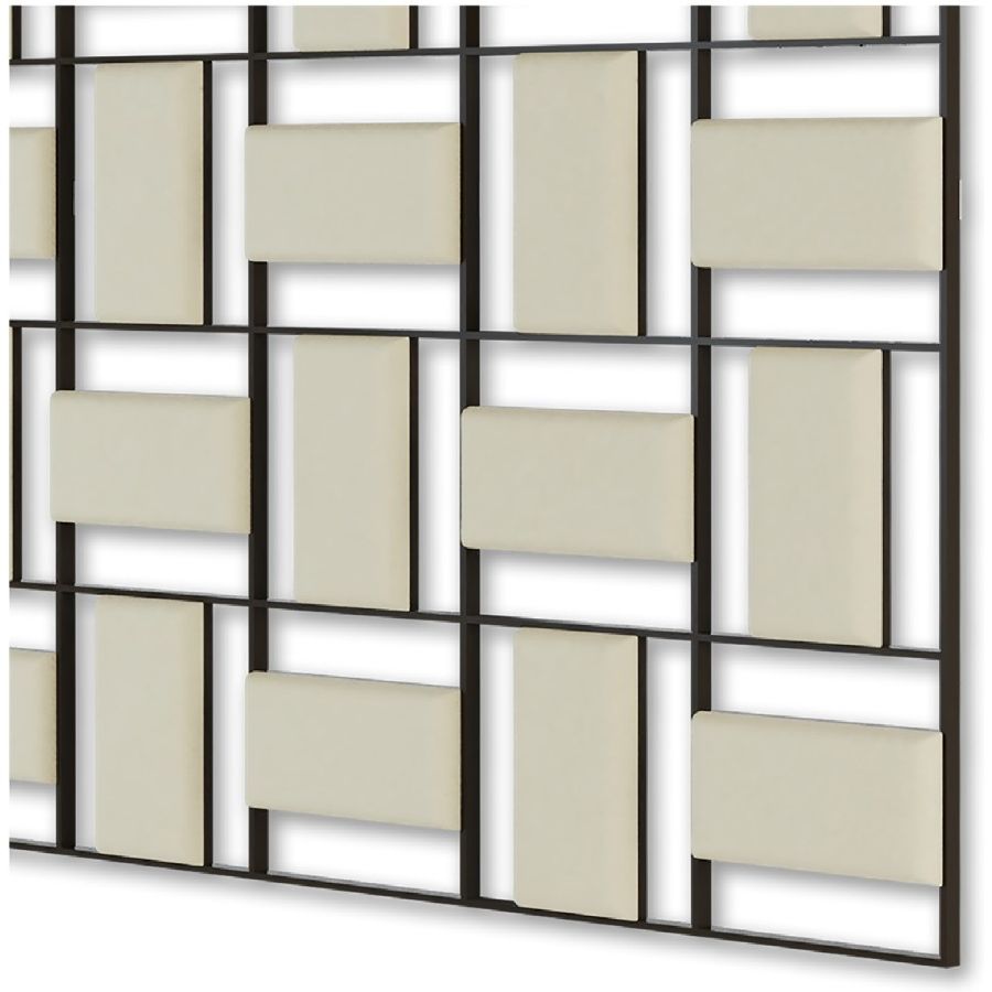 This contemporary styled headboard features perpendicular upholstered panels within a forged iron frame. A true statement piece!