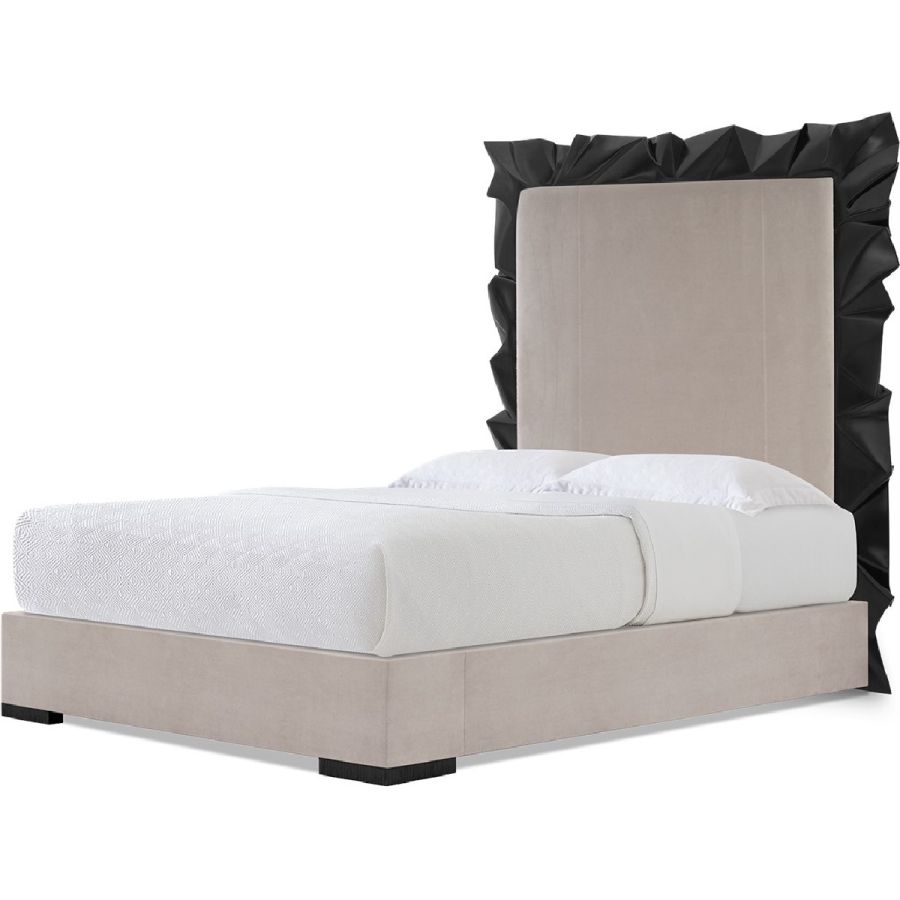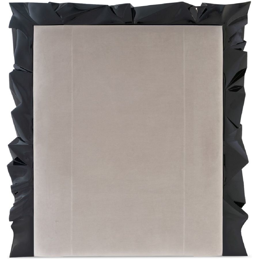A showstopping piece with a crumpled rectangular design in hand-carved wood framing an upholstered headboard.