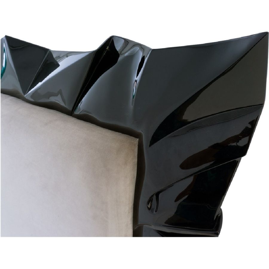 A showstopping piece with a crumpled rectangular design in hand-carved wood framing an upholstered headboard.