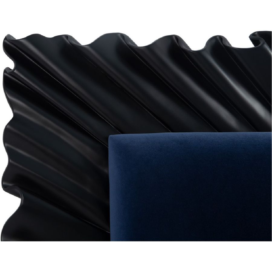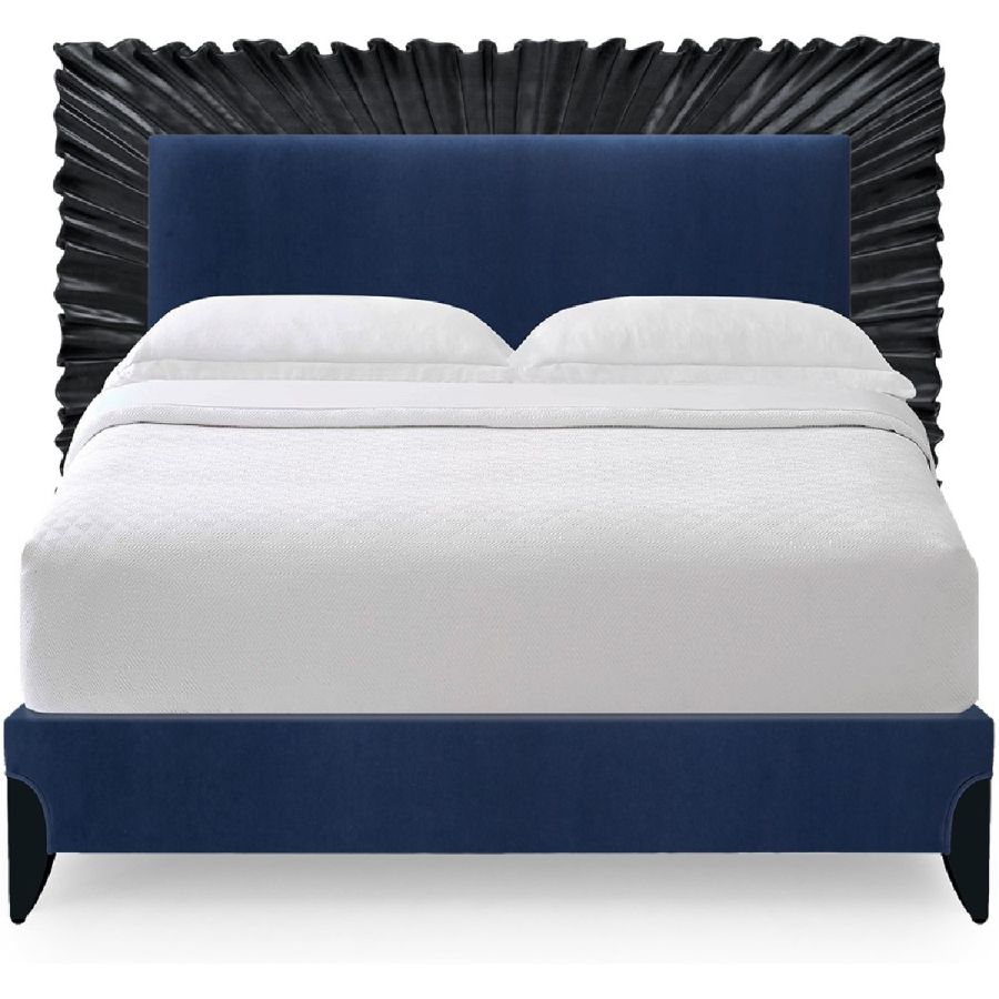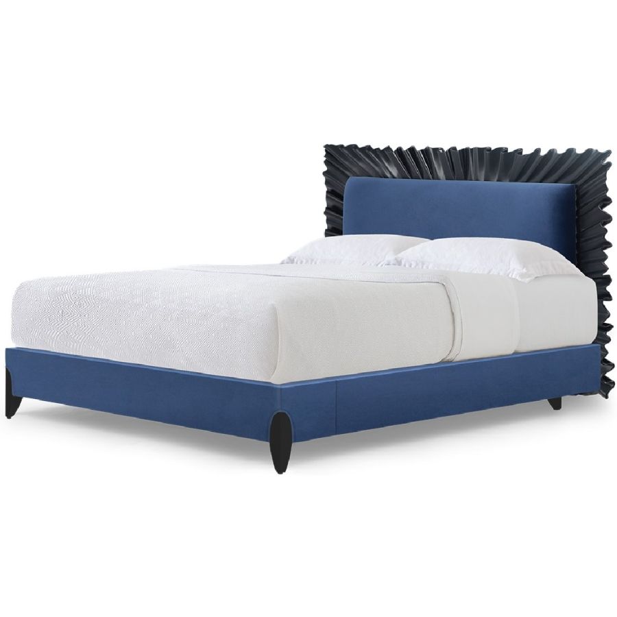 To render a dramatic statement to any bedroom, a flourish of exquisitely hand-carved mahogany in a ruffle design.