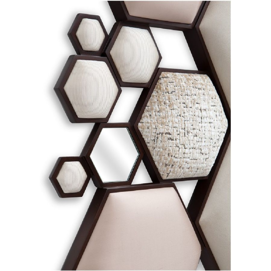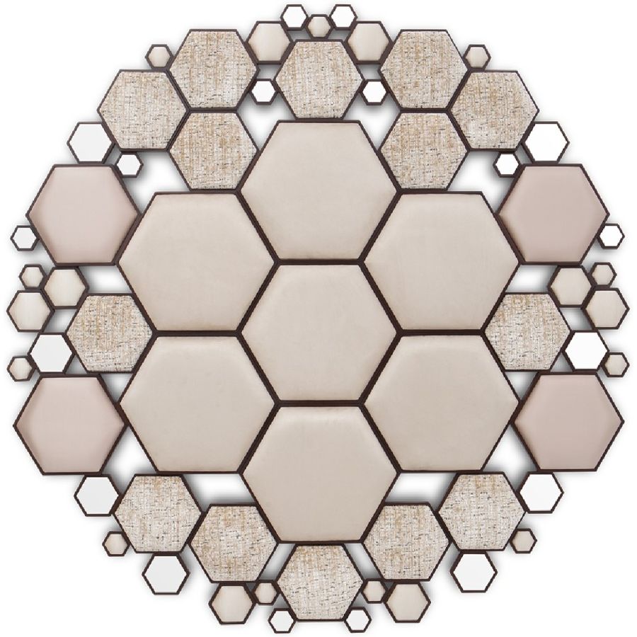 Inspired by the French-Hungarian artist credited as the grandfather and leader of the Op Art movement, Vasarely is an exquisite and mesmerising headboard formed of a total of 62 various sized upholstered and mirror hexagons in wood frames forming a sparkling circle. Made to fit any standard size of bed. Simply spectacular! Also available with upholstered only hexagons (20-0799)