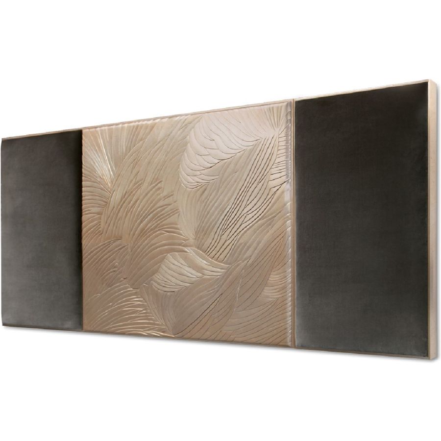 A stunning triptych headboard featuring two upholstered panels with a hand carved wood panel in the center. The relief carving on the central panel is expertly carved to resemble a painter's brush strokes, making this extraordinary piece a unique showstopper for any style of bedroom.