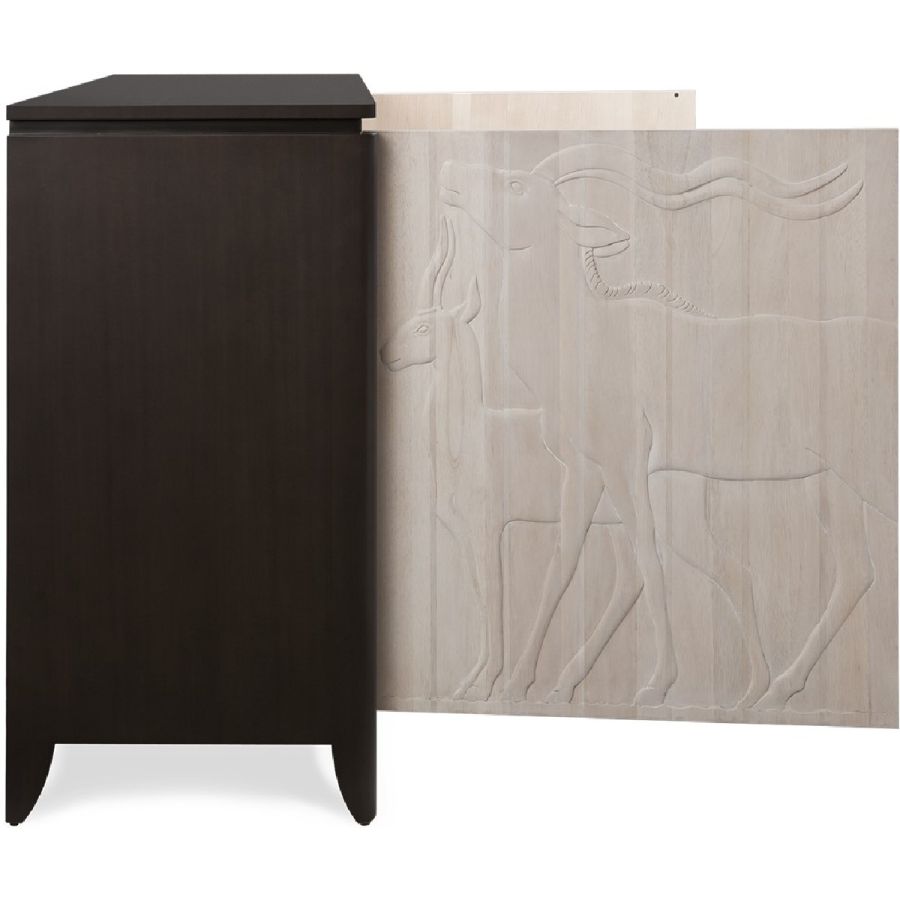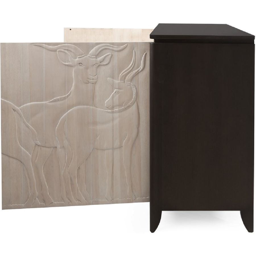 This magnificent cabinet features hand-carved gazelle scenes on front-opening doors, with wooden top. The inside contains a row of drawers along the top, with a horizontal shelf for optimum use of space. The facings are based on plaques at the New York Natural History Museum, following a visit by Christopher.