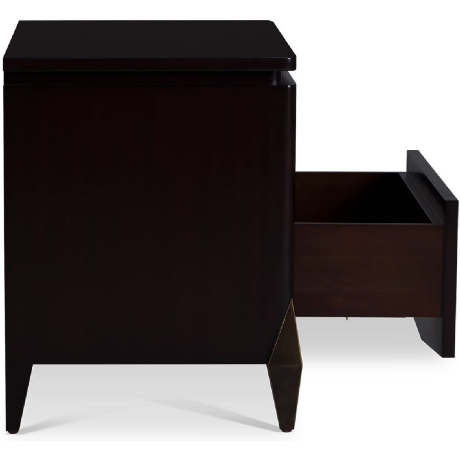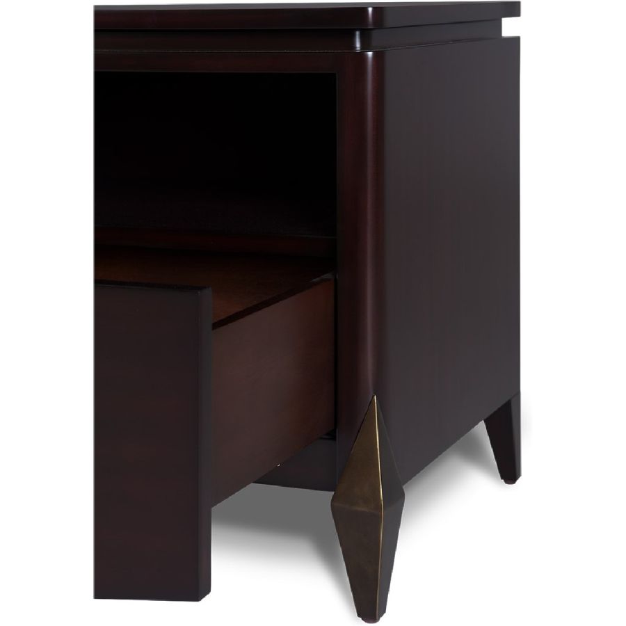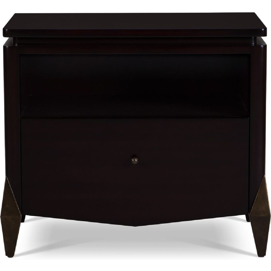 With classic styling, this elegant nightstand in hand crafted mahogany features a drop V-shaped front for a contemporary twist. The single drawer under an open compartment is lined in ultra-suede and the dimensions make this the perfect nightstand for most bedroom settings.