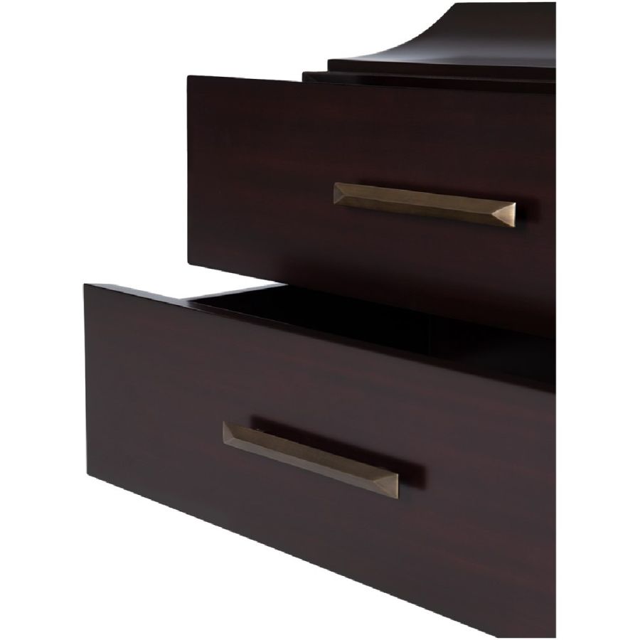 This beautiful hand carved nightstand features a raised top with elegant curved sides and two practical drawers with wide brass or nickel handles. A timeless classic!