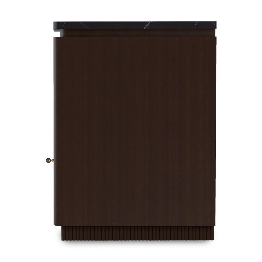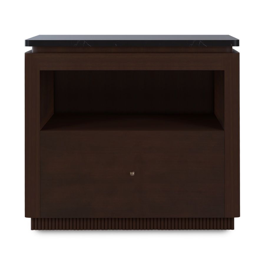 A classic mahogany nightstand with marble top in stunning Nero Marquina and feature ribbed base. The single drawer under an open compartment is lined in ultra-suede and the dimensions make this the perfect nightstand for most bedroom settings.
