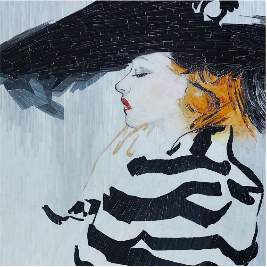 Expertly created with thousands of sparkling hand-cut, hand-placed colored glass pieces, this stunning mosaic features an elegant Parisienne lady in hat and New Look-style. An absolutely show-stopping piece!