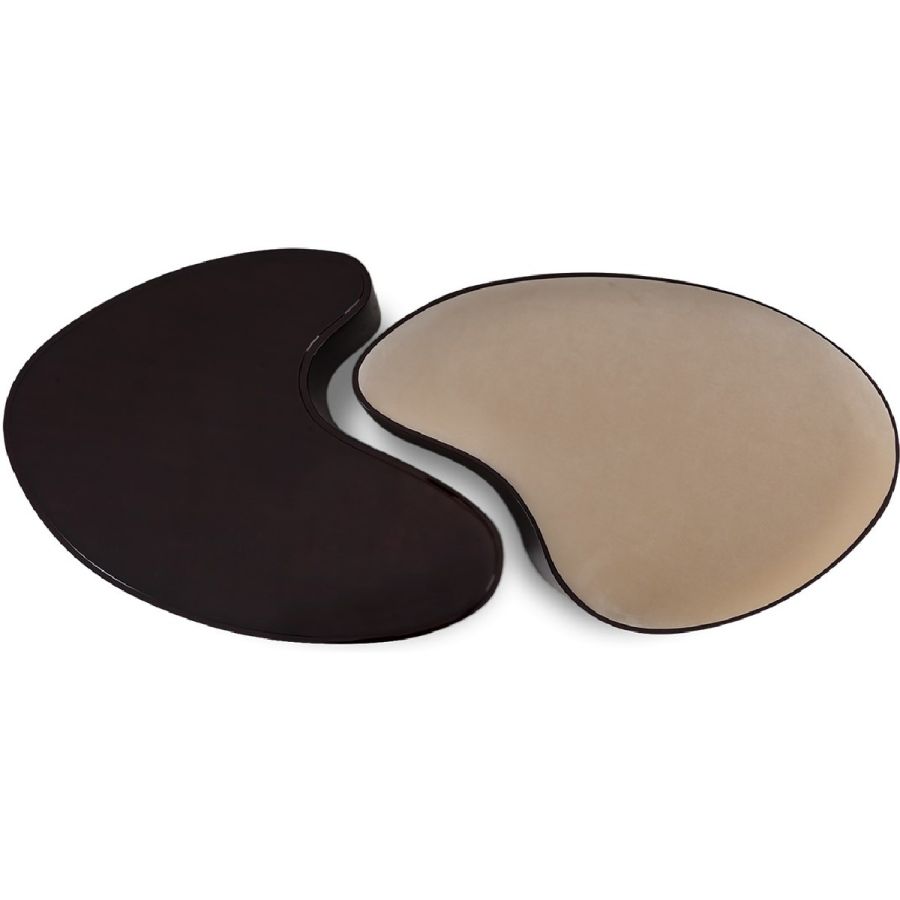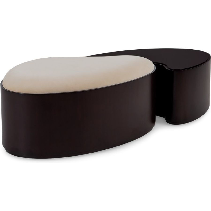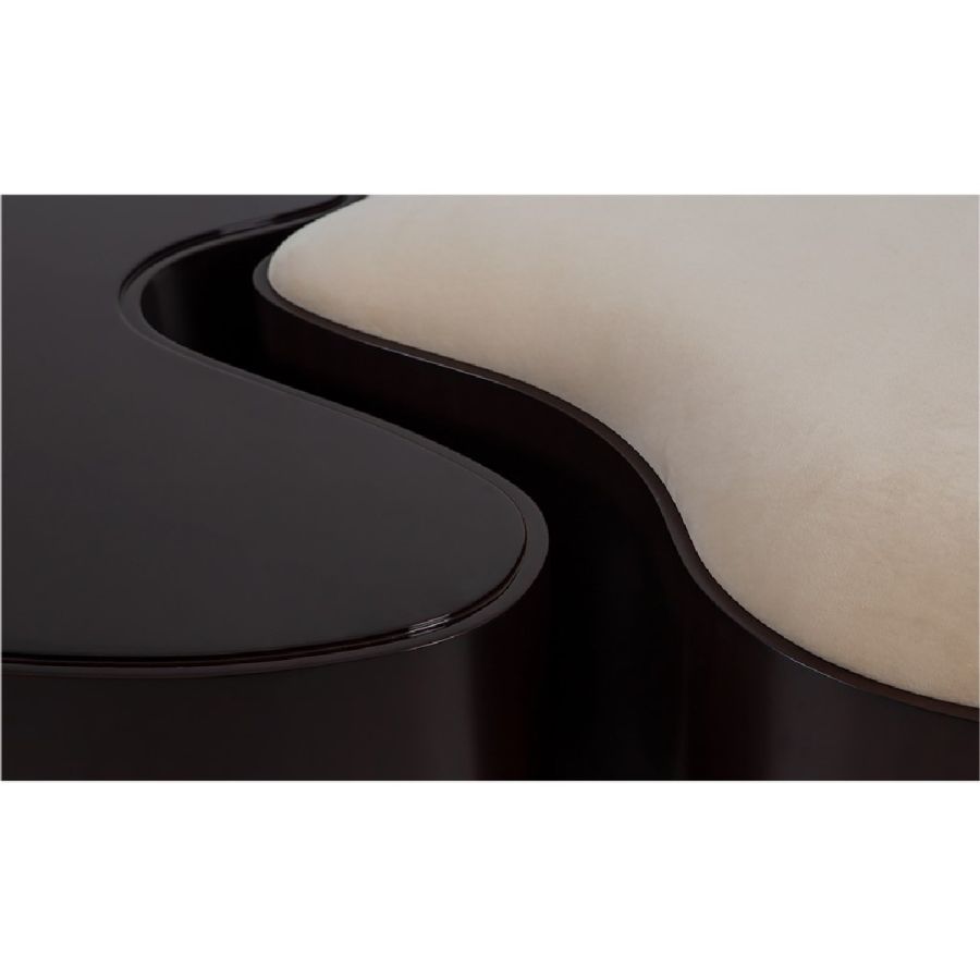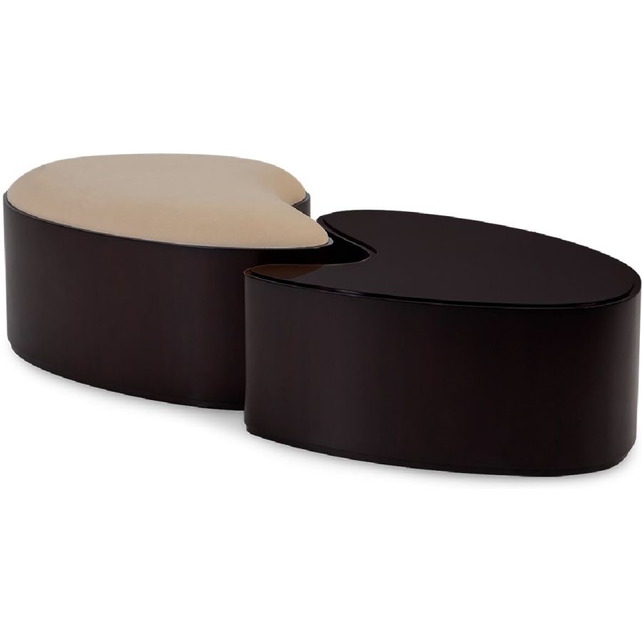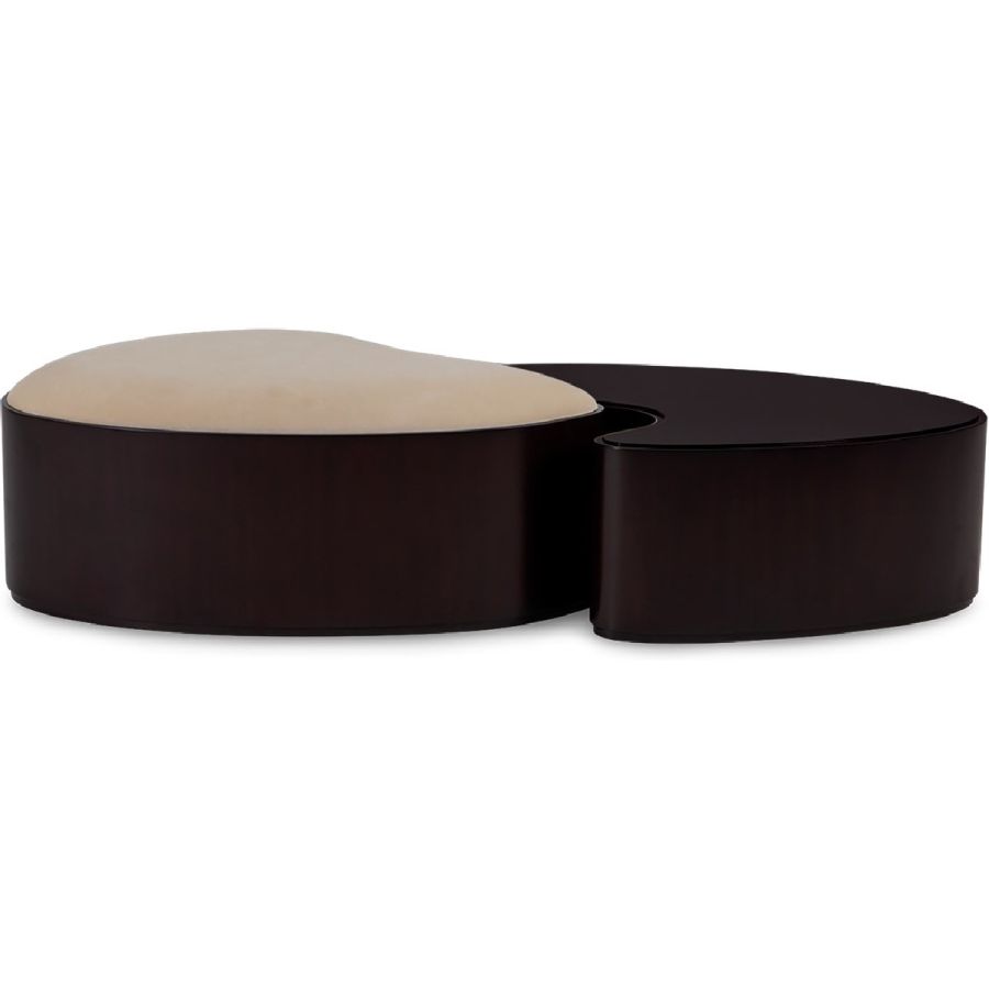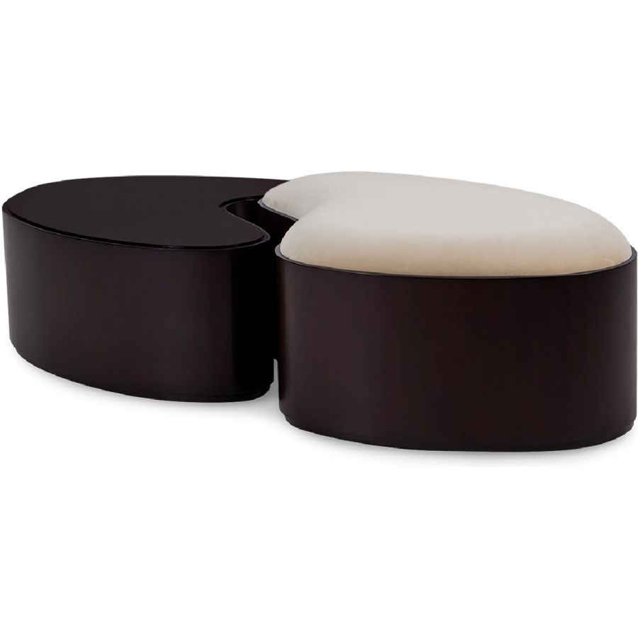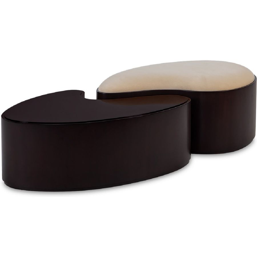 Combining style and function, this fabulous ottoman and coffee table set takes inspiration from the yin yang symbol, the ancient Chinese concept of interconnecting and counterbalancing forces. This exquisitely hand carved and upholstered set will bring the ultimate in harmony to any interior setting.