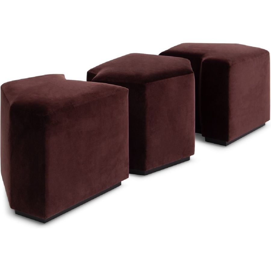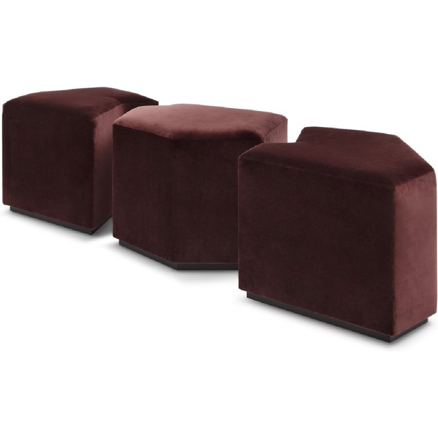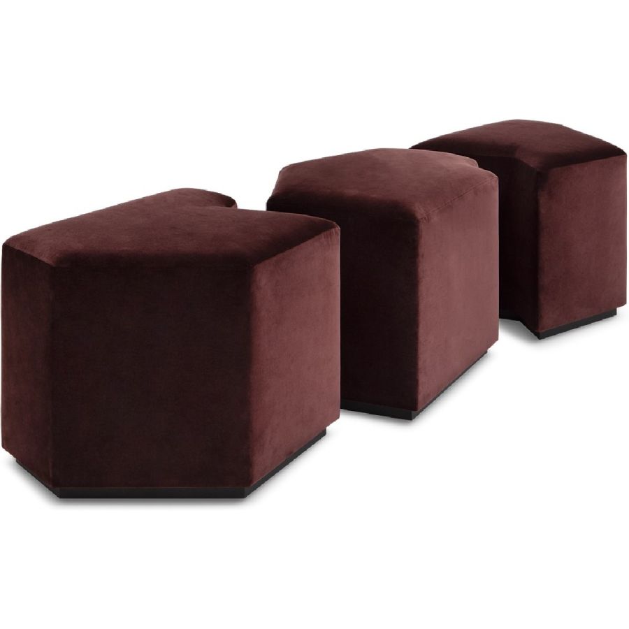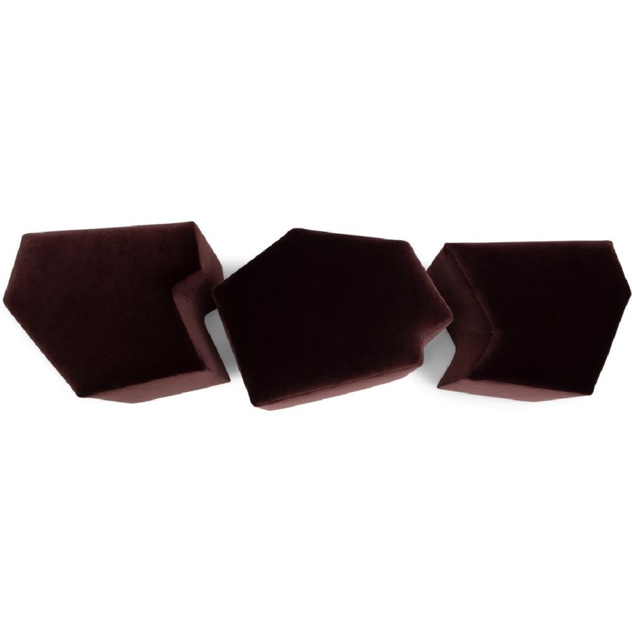 A set of three irregular gem-shaped ottomans that can be positioned together to form a bench. Practical and beautiful, this set can be used in bedrooms, living rooms, hallways and entrances and even bathrooms, and makes for a flexible and unusual seating complement.