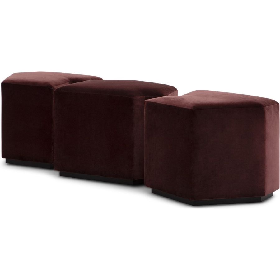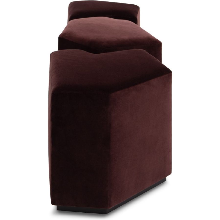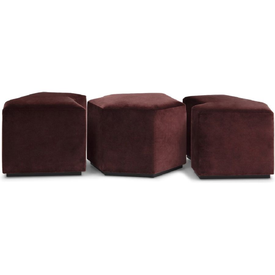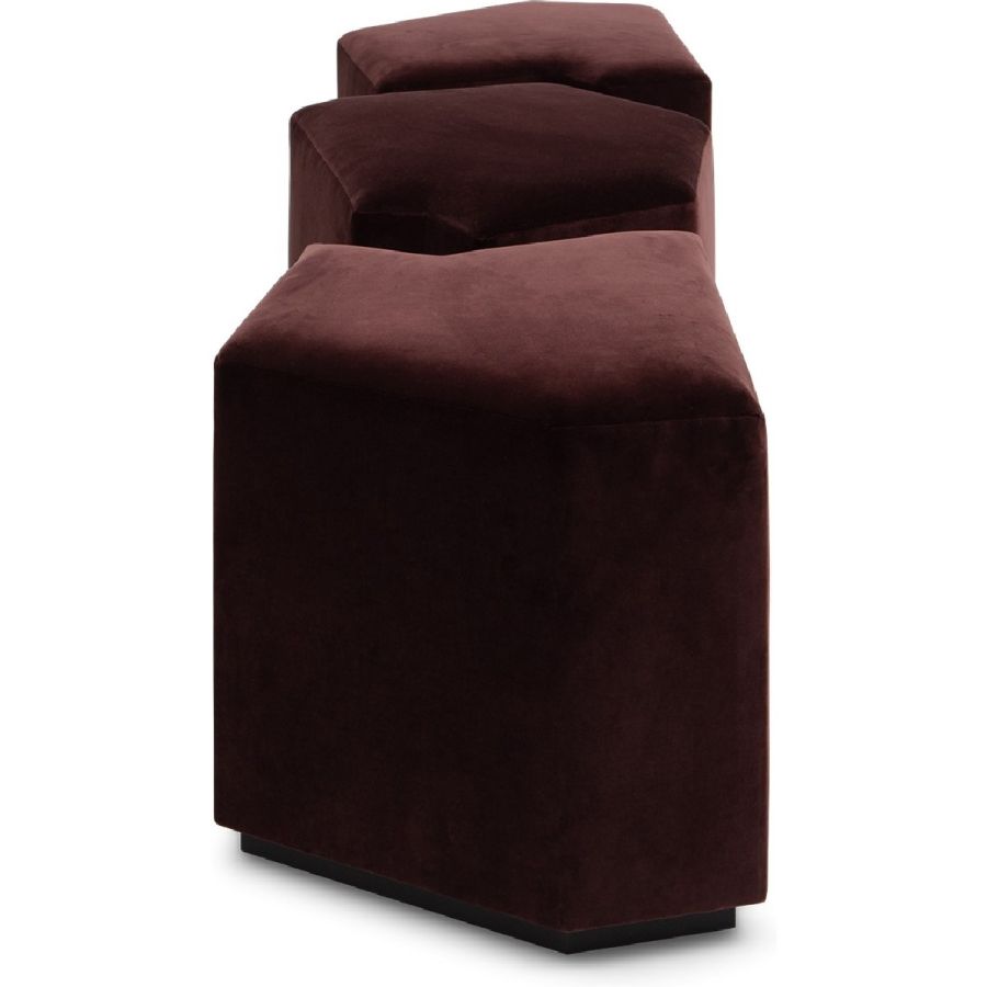 A set of three irregular gem-shaped ottomans that can be positioned together to form a bench. Practical and beautiful, this set can be used in bedrooms, living rooms, hallways and entrances and even bathrooms, and makes for a flexible and unusual seating complement.