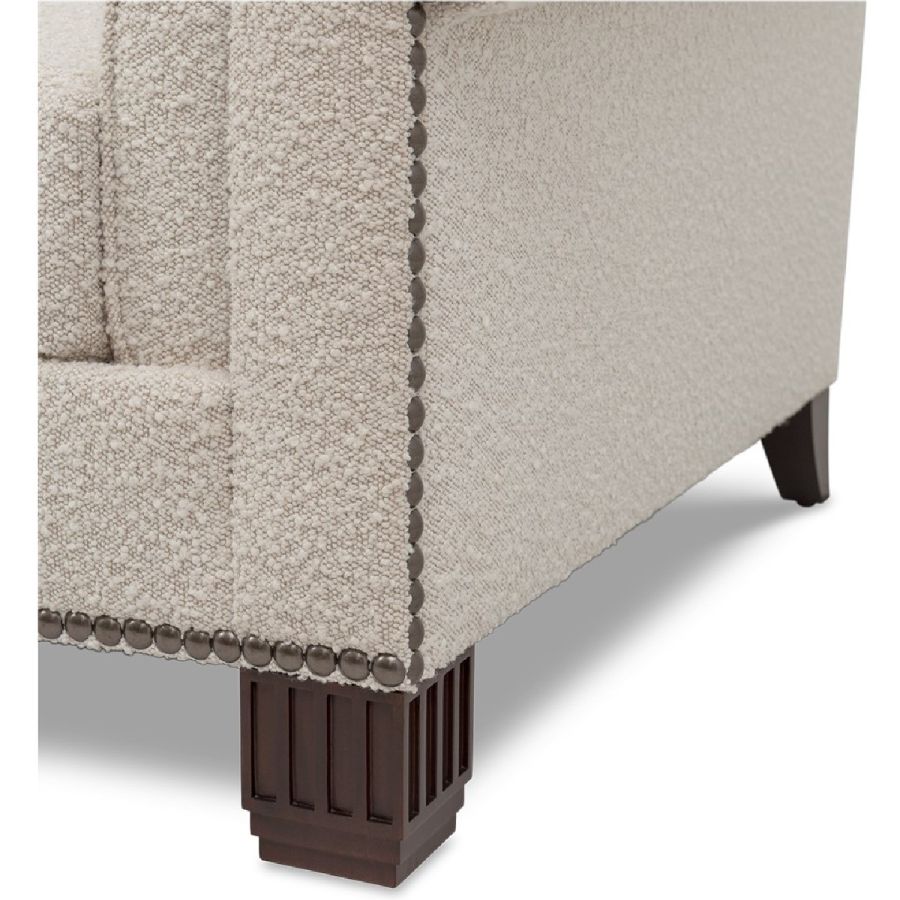 Doweled mortise and tenon frame in solid Mahogany from certified source. Mahogany legs. Eight-way hand tied spring base, with pocket coil seat cushions encased in high-resilient fill and feathered down jacket. Feathered down throw pillows mixed with PolyFiber for added support. Individually hammered nail-head trim. For residential use only. Commercial use is classified as Special Order Design (SOD), and alternative materials may be required. Contact us for details.