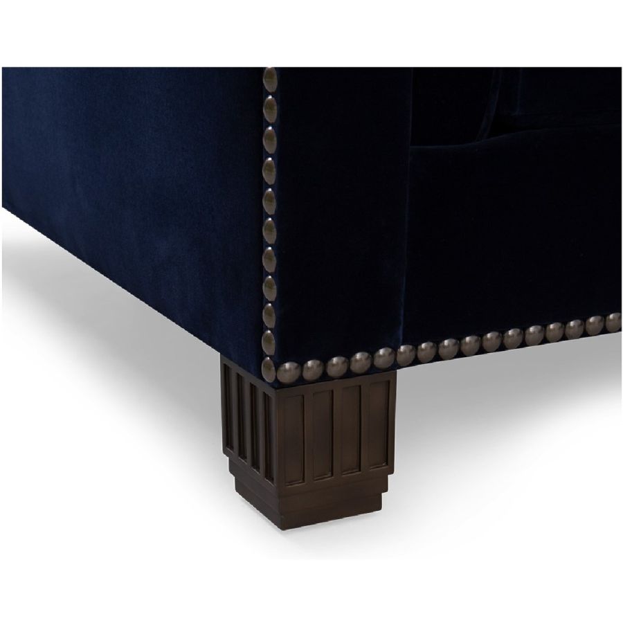 Doweled mortise and tenon frame in solid Mahogany from certified source. Mahogany legs. Eight-way hand tied spring base, with pocket coil seat cushions encased in high-resilient fill and feathered down jacket. Feathered down throw pillows mixed with PolyFiber for added support. Individually hammered nail-head trim. For residential use only. Commercial use is classified as Special Order Design (SOD), and alternative materials may be required. Contact us for details.