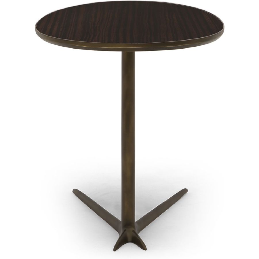 Swan leg metal base with cantilevered elliptical top, this hand worked cocktail side table is visually stunning.