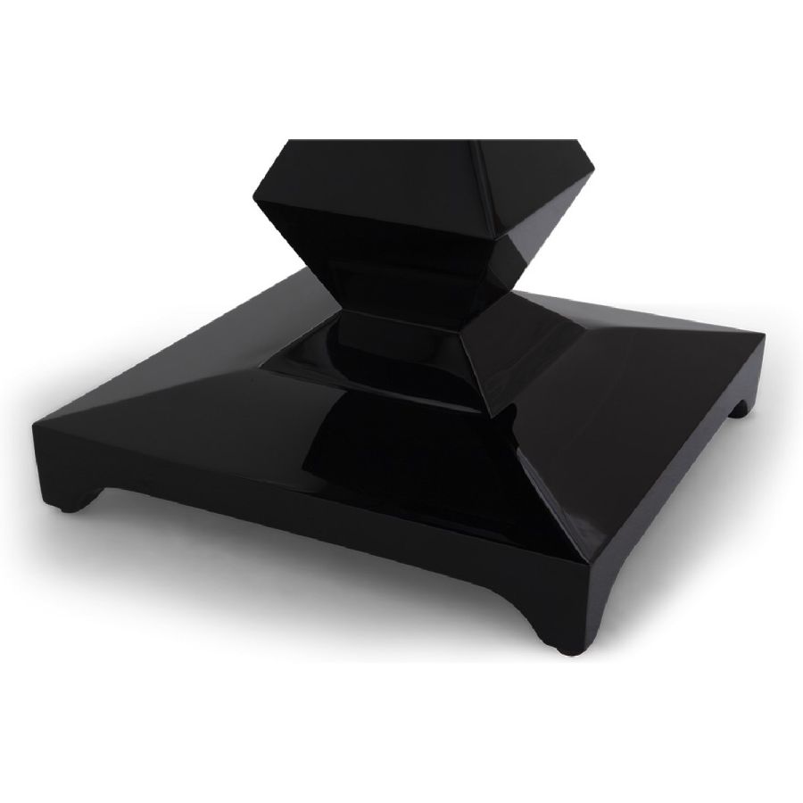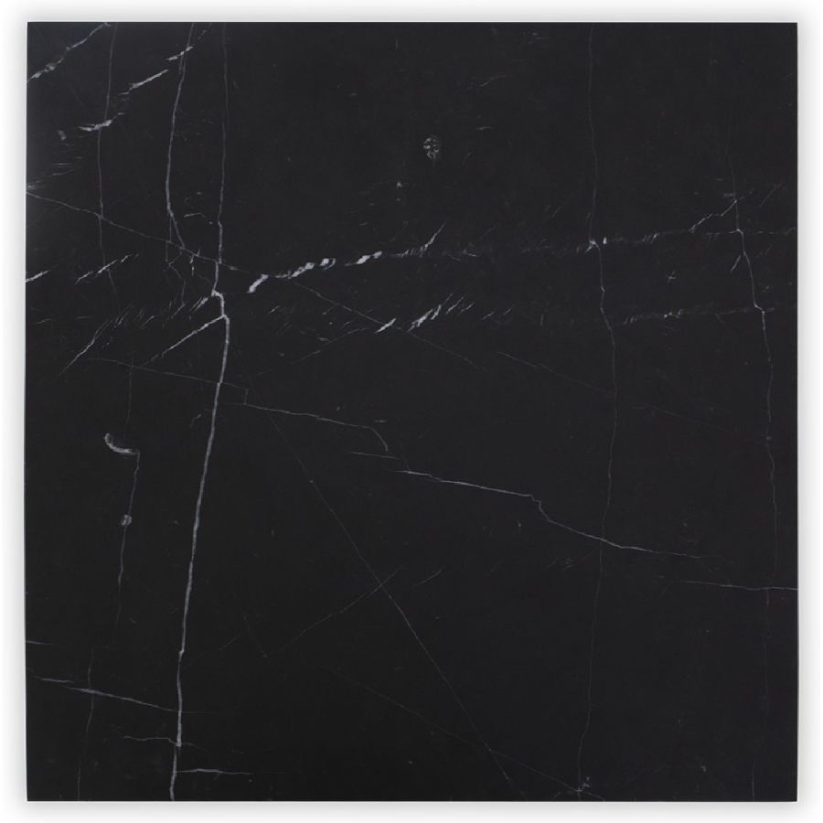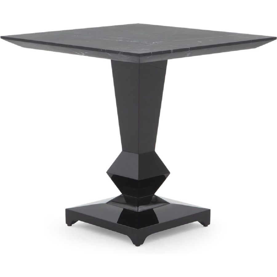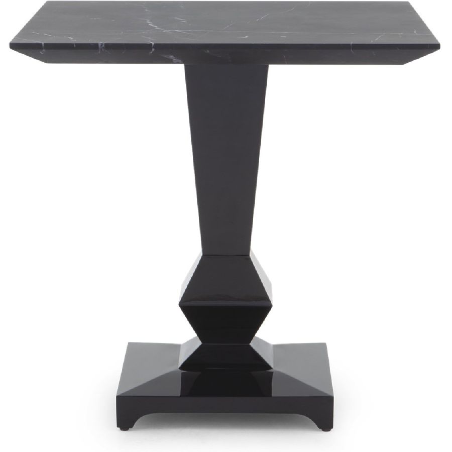 An impactful side table featuring a square top in Marquina marble and a hand-shaped base tapering into an angular square pedestal.
