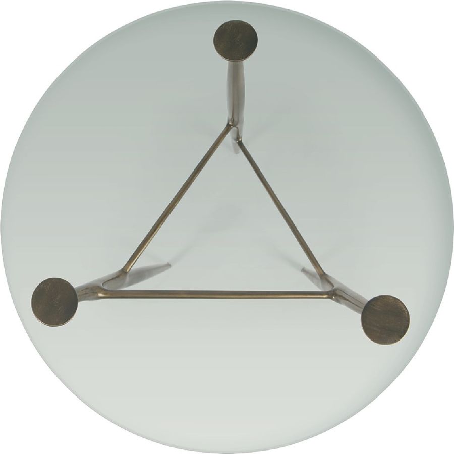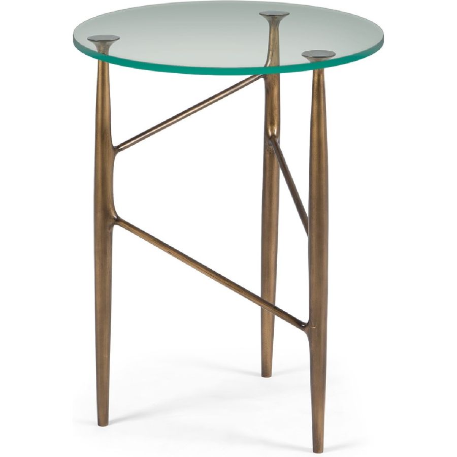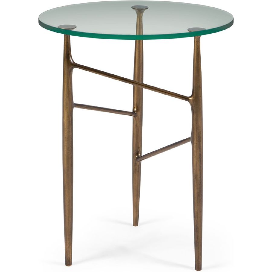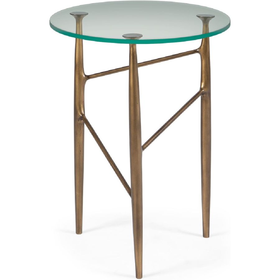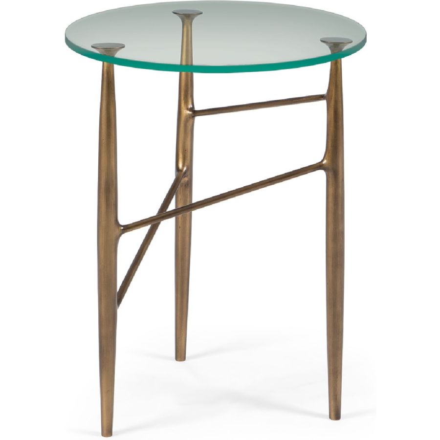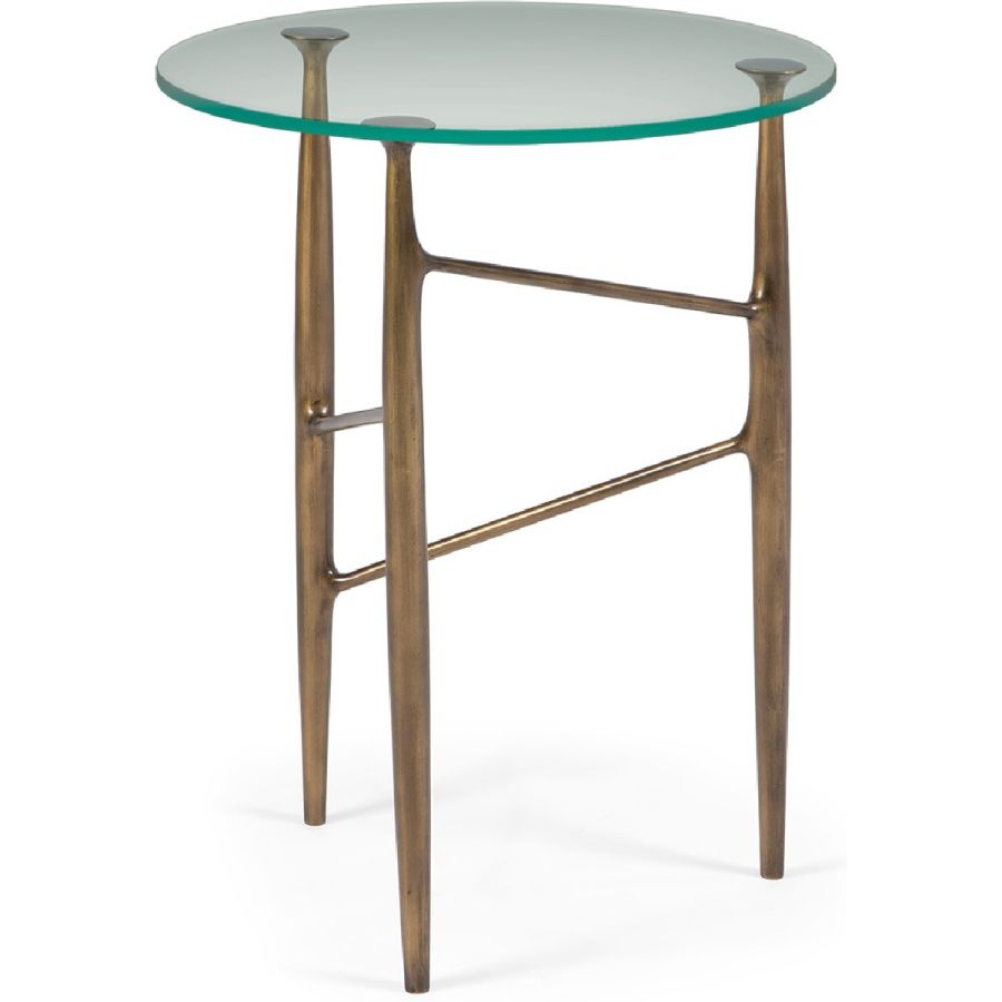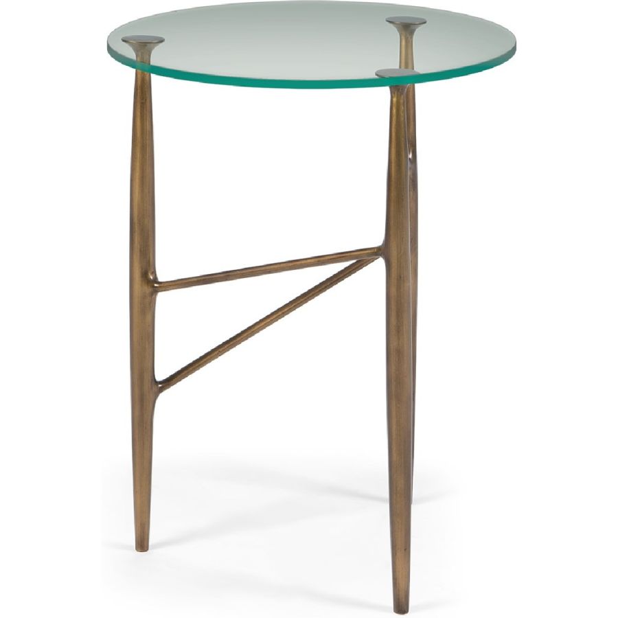 Solid aged brass lower base. Toughened tempered clear glass top. For residential use only. Commercial use is classified as Special Order Design (SOD), and alternative materials may be required. Contact us for details.