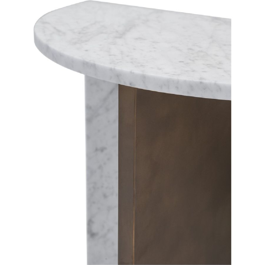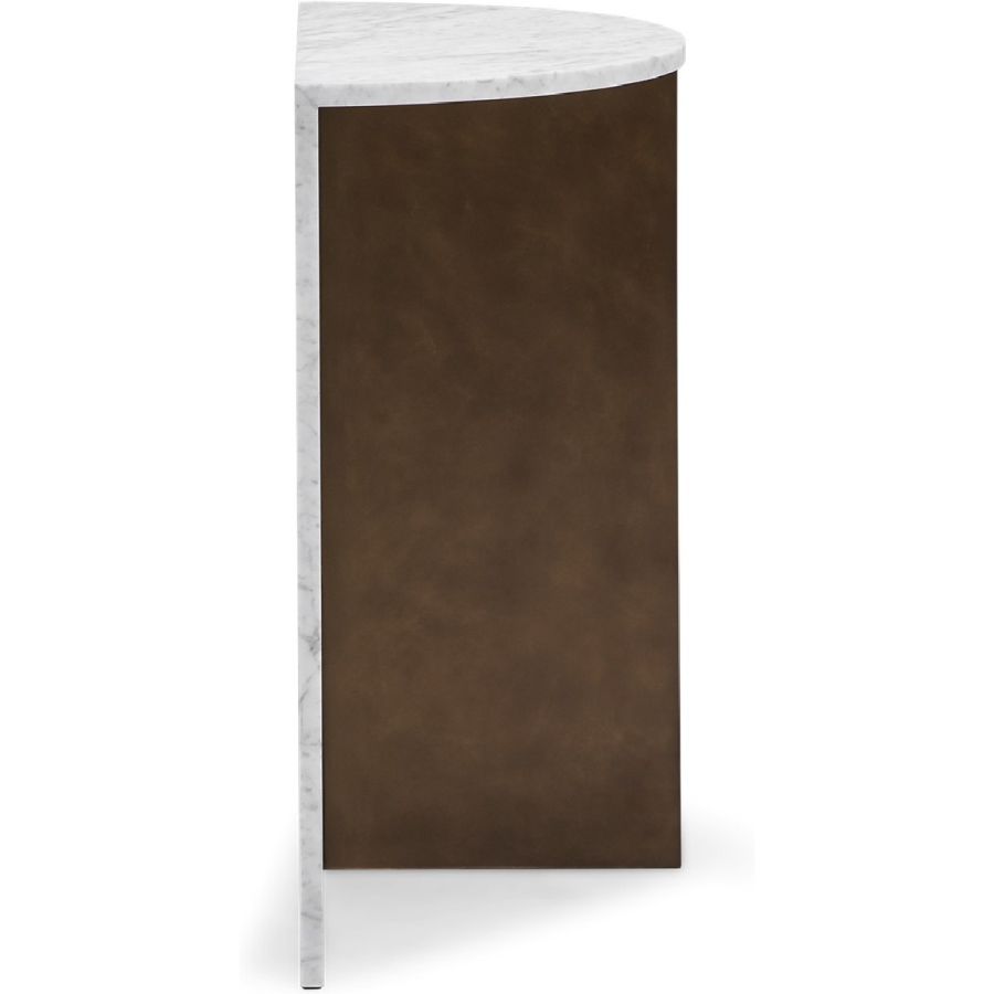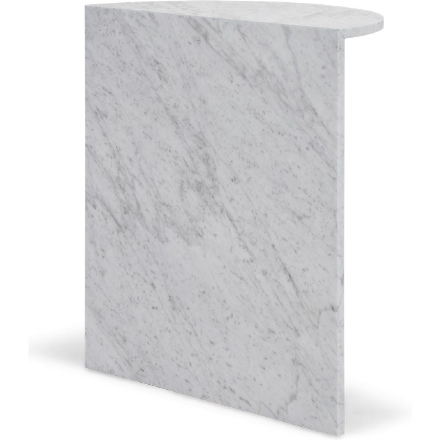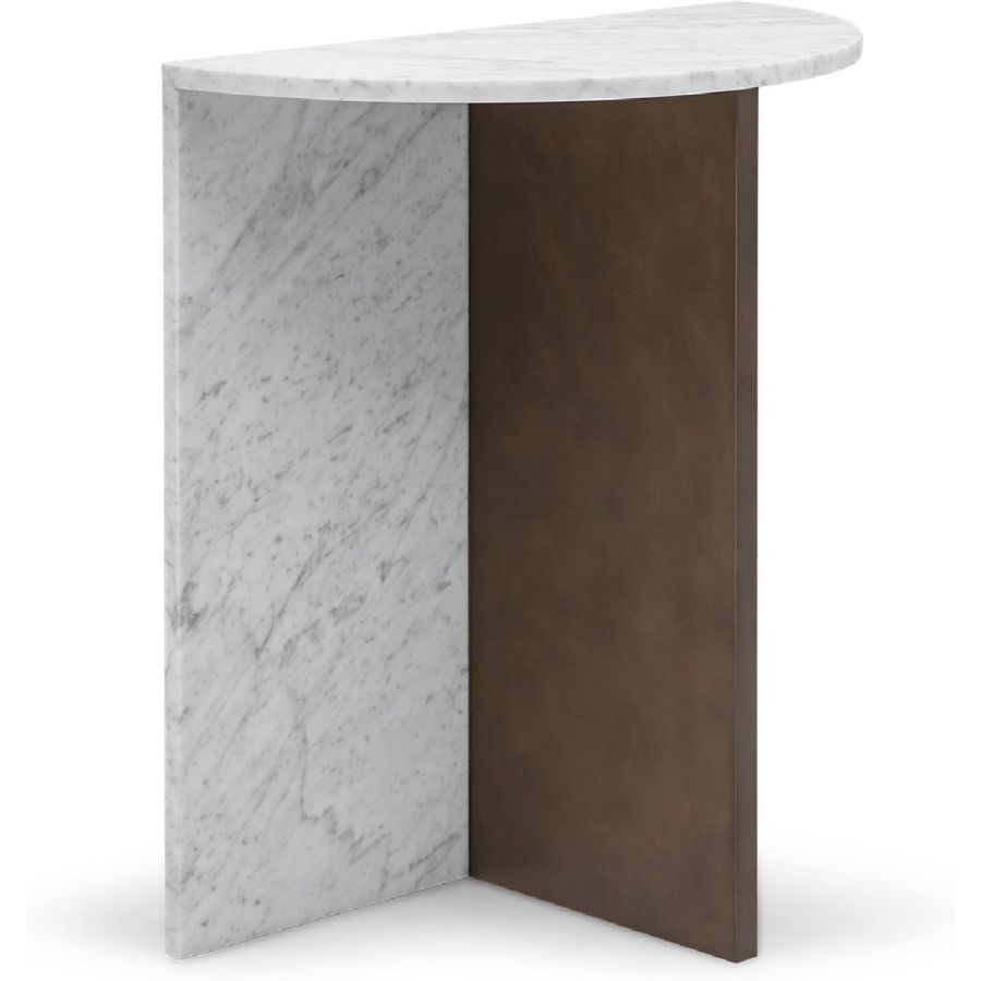 Simplicity and flair define this end table, formed of a semi-circular marble top and marble back base in a choice of Nero Marquina or white Carrara, with a central support in forged iron.