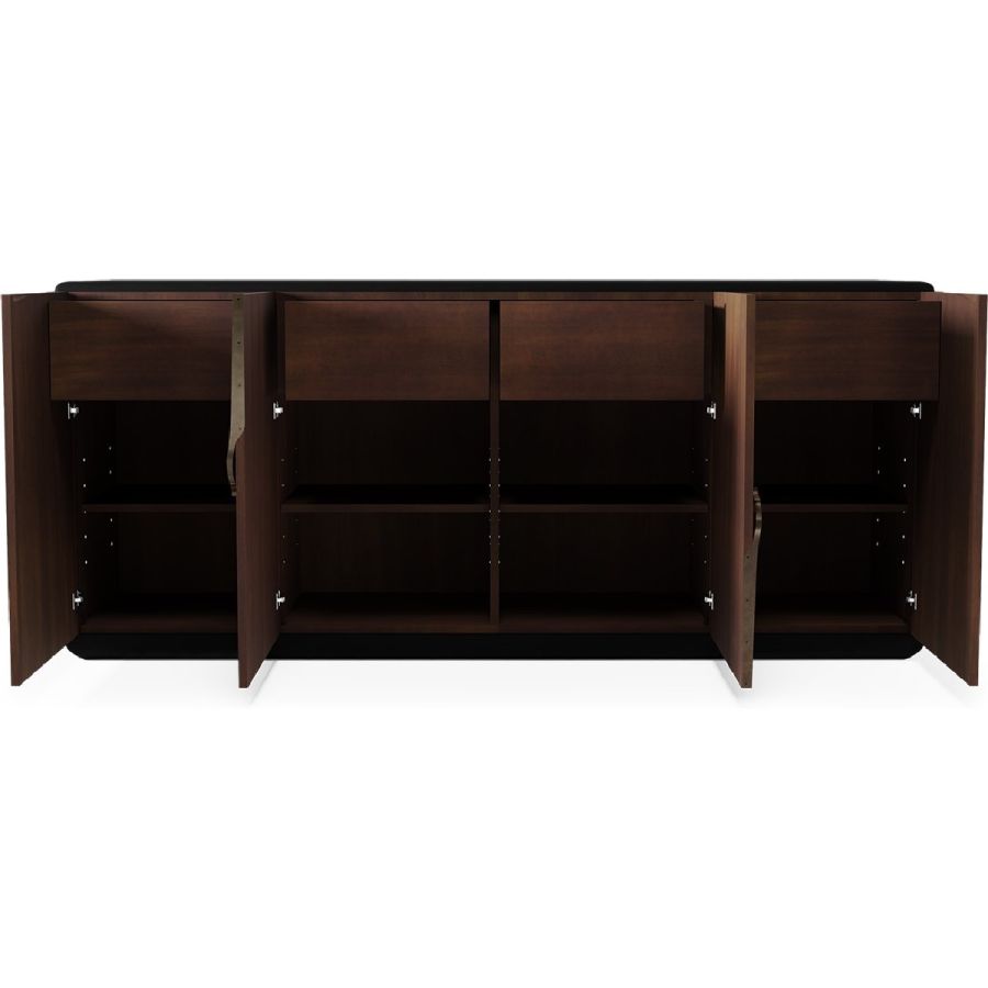 Embellished with a single open spiral curved brass handle, this exceptional sideboard is both practical and elegant. The four doors open to reveal four drawers and eight storage compartments, perfect for storing cutlery and dining sets. A piece to grace dining or living room settings with classic, modern or contemporary décor. Also available as a cabinet (84-0063) and as a nightstand (84-0064).