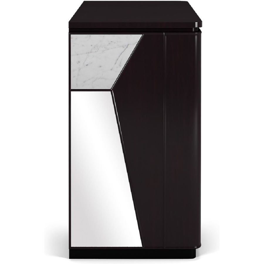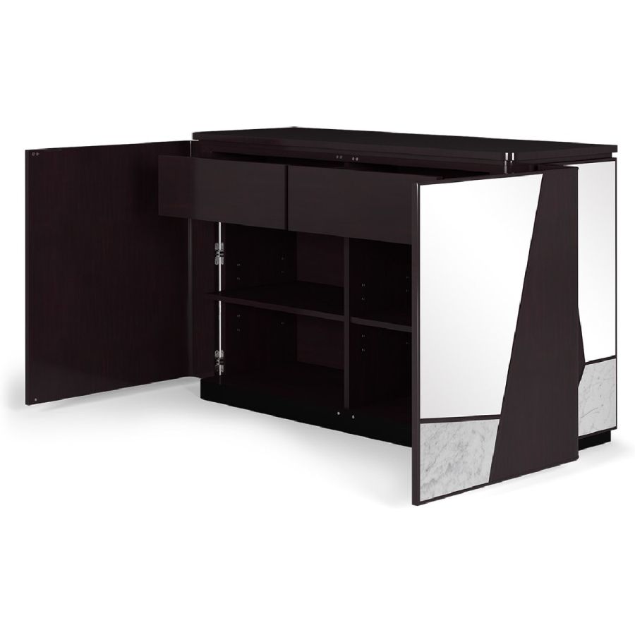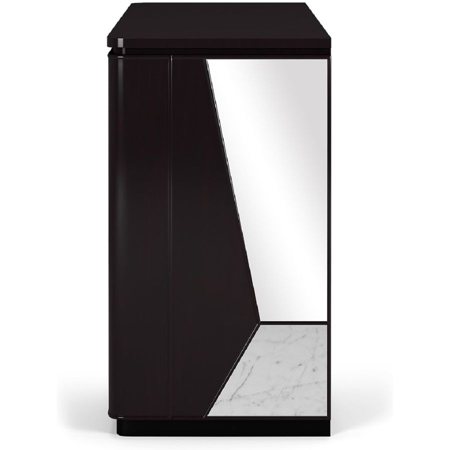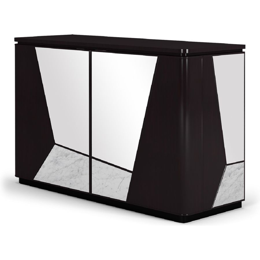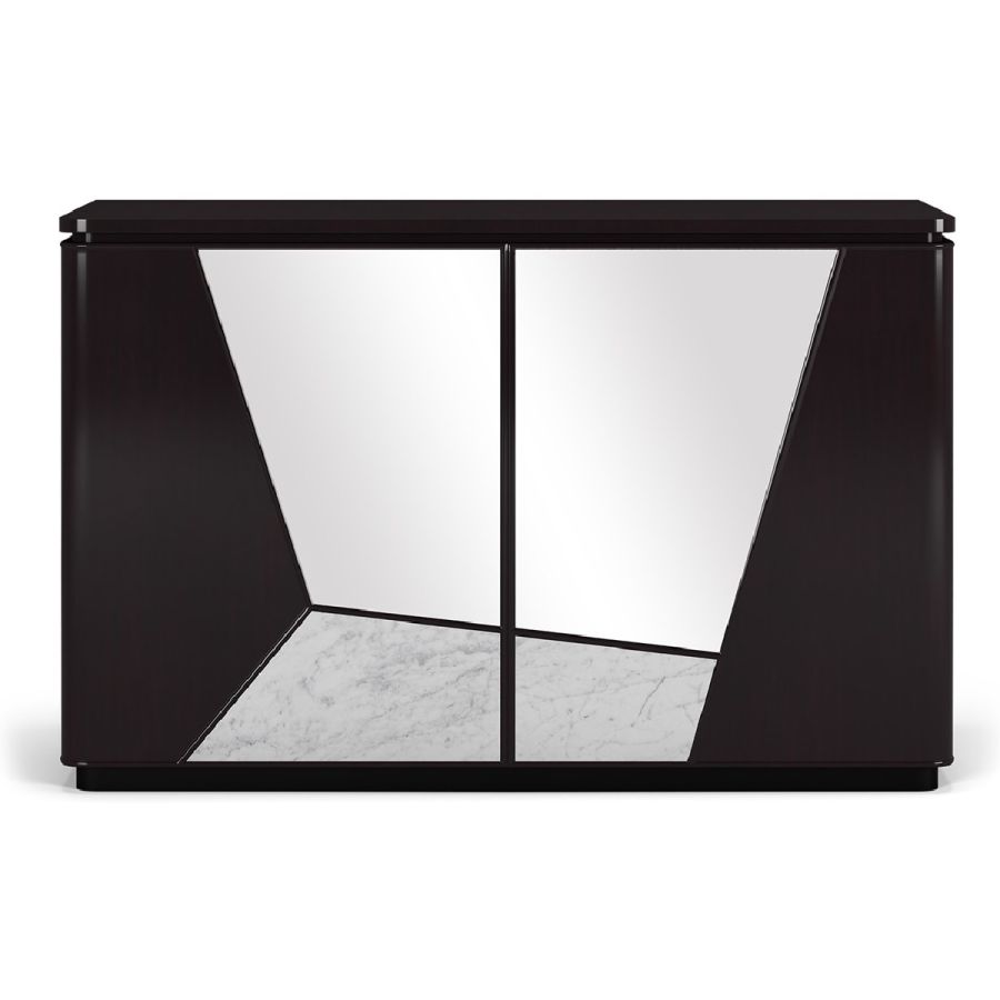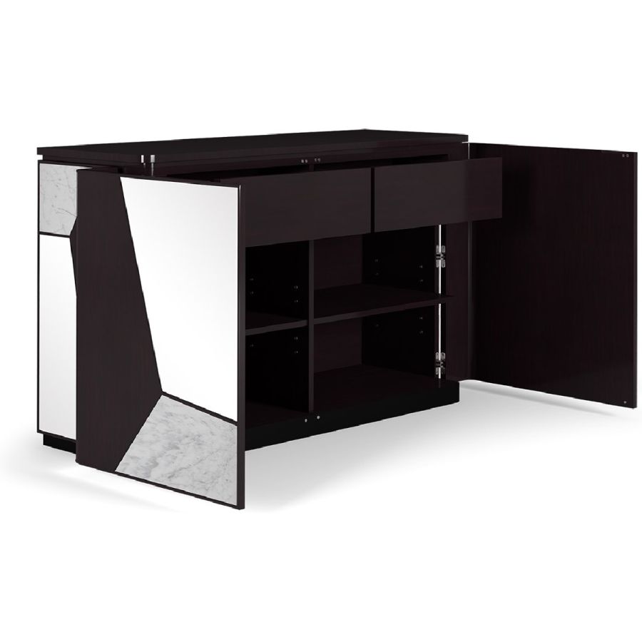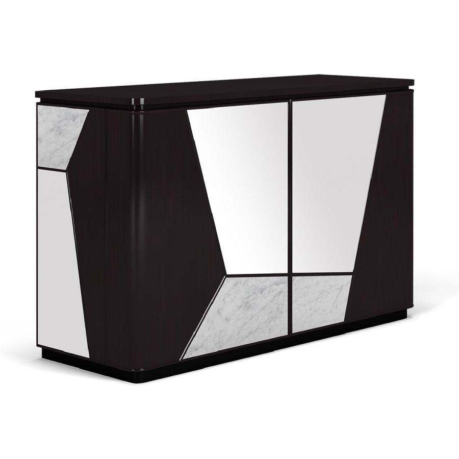 A highly original sideboard, Modal features a combination of wood, mirror and Nero Marquina or white Carrara marble in irregular angular sections, for a striking look. The sideboard has 2 doors concealing practical adjustable shelving, and 2 drawers.A spectacular way to add a contemporary flourish to any style of setting.