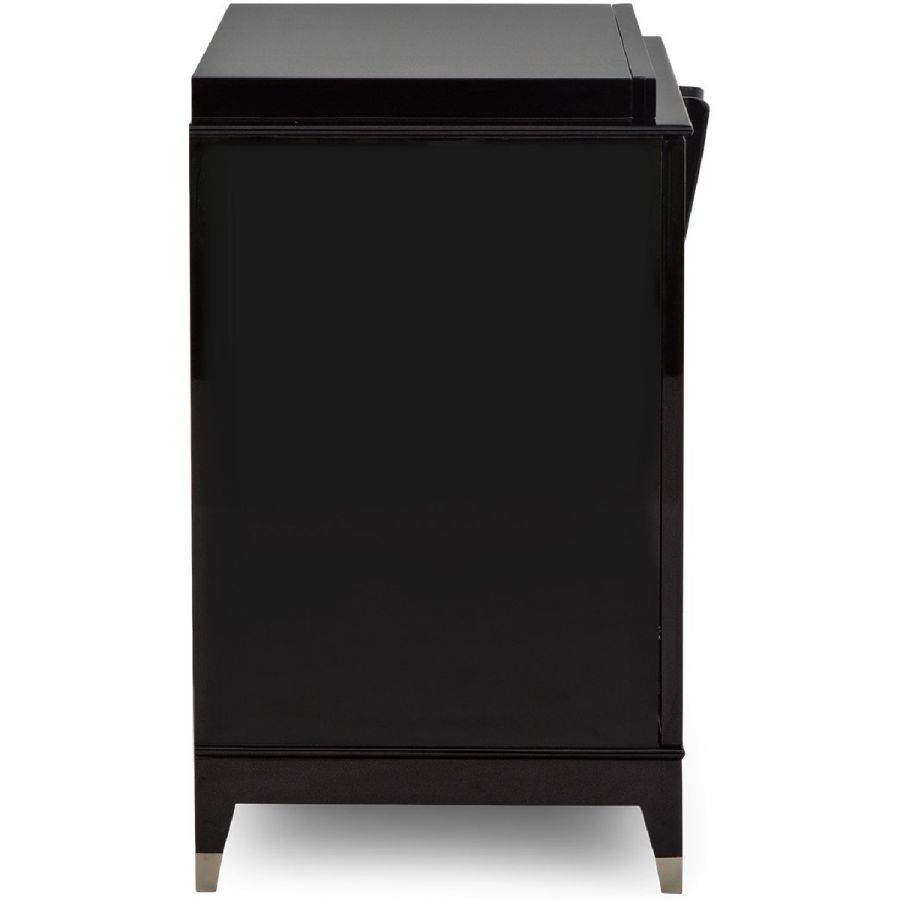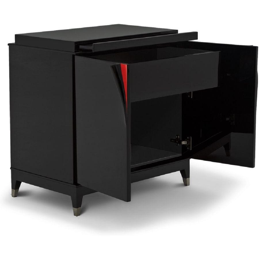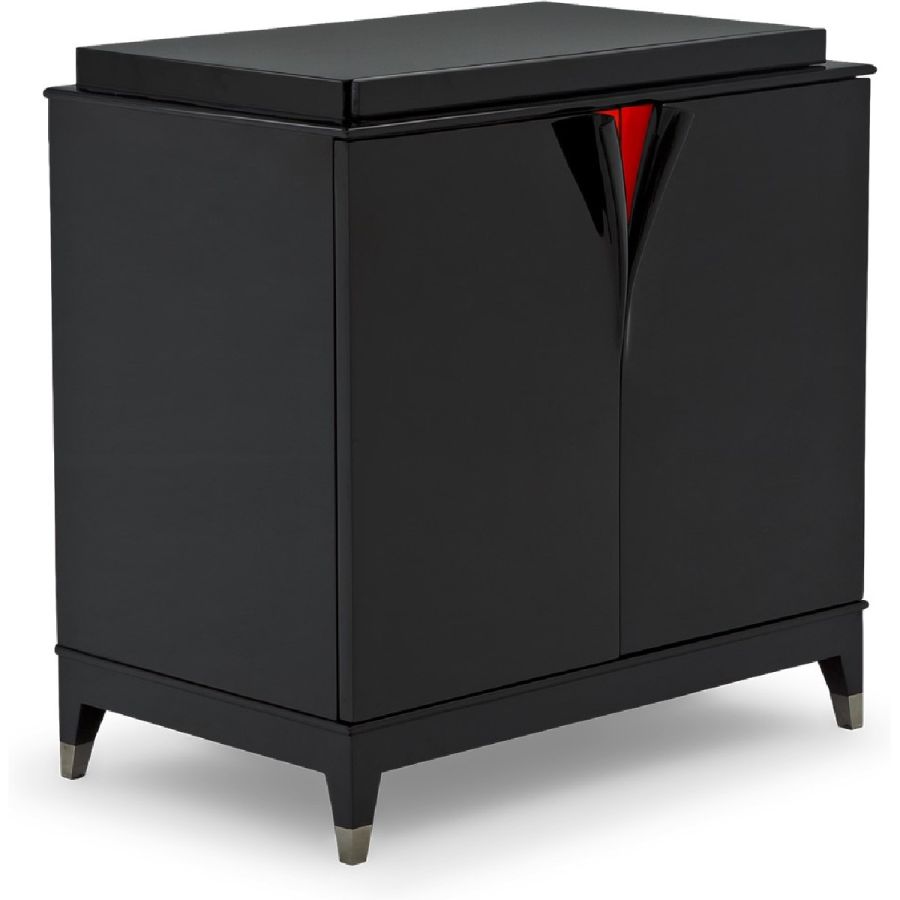 An elegant chest or bedside table with metal finish tipped feet, displaying hand-carved scroll work forming the handles in a fan design. Opening with twin front doors, inside is a drawer, pull-out tray and two separate interior spaces, delivering utility in a graceful and alluring form.