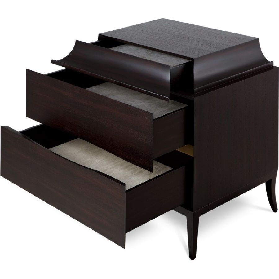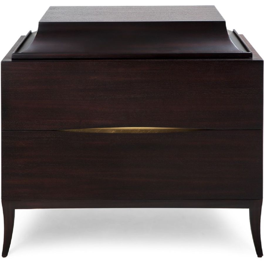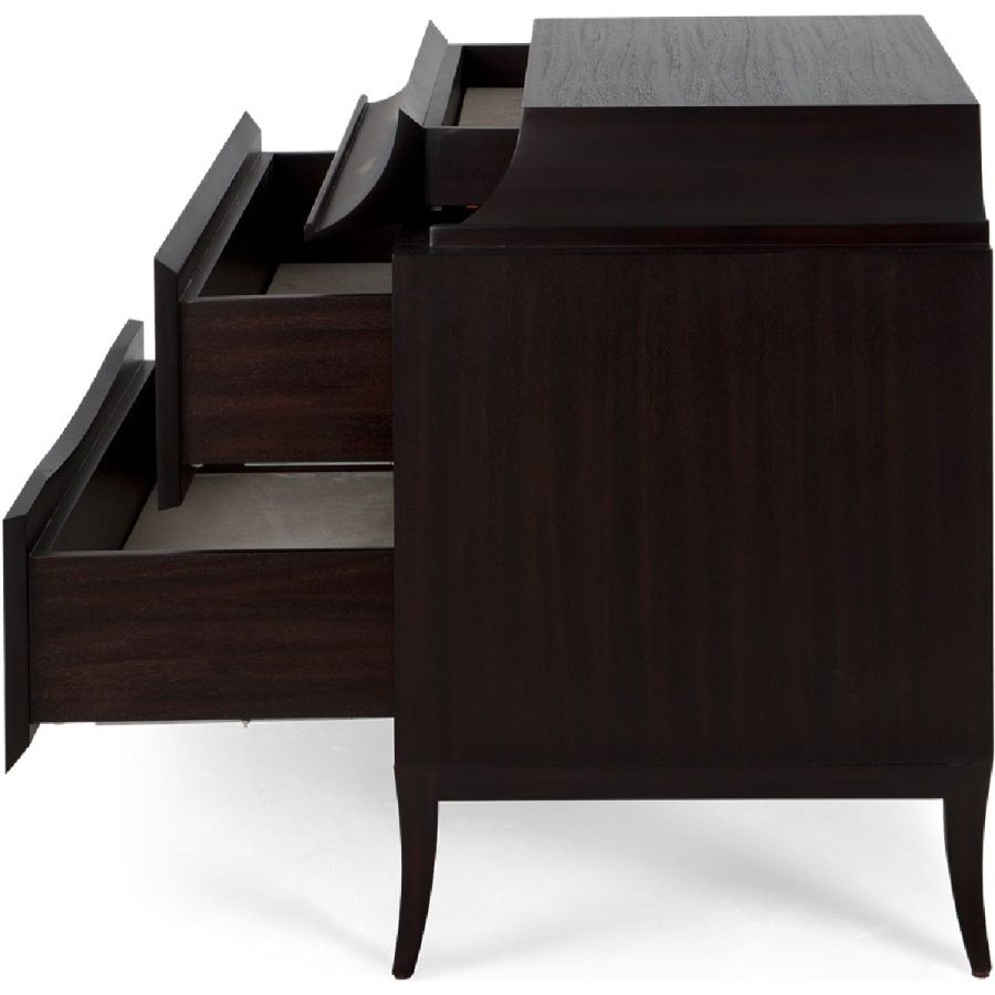 Stunningly sophisticated three-drawer chest with saber legs and Silk-cut opening, hand-carved from solid wood. Includes a drawer concealed in the curved top section.