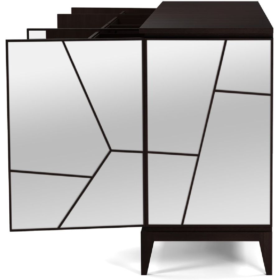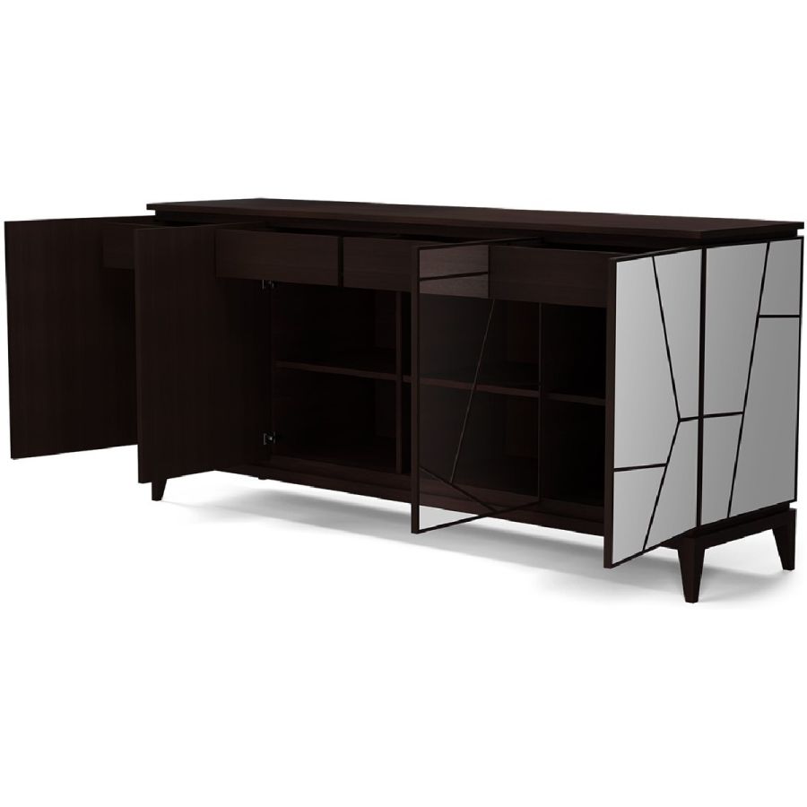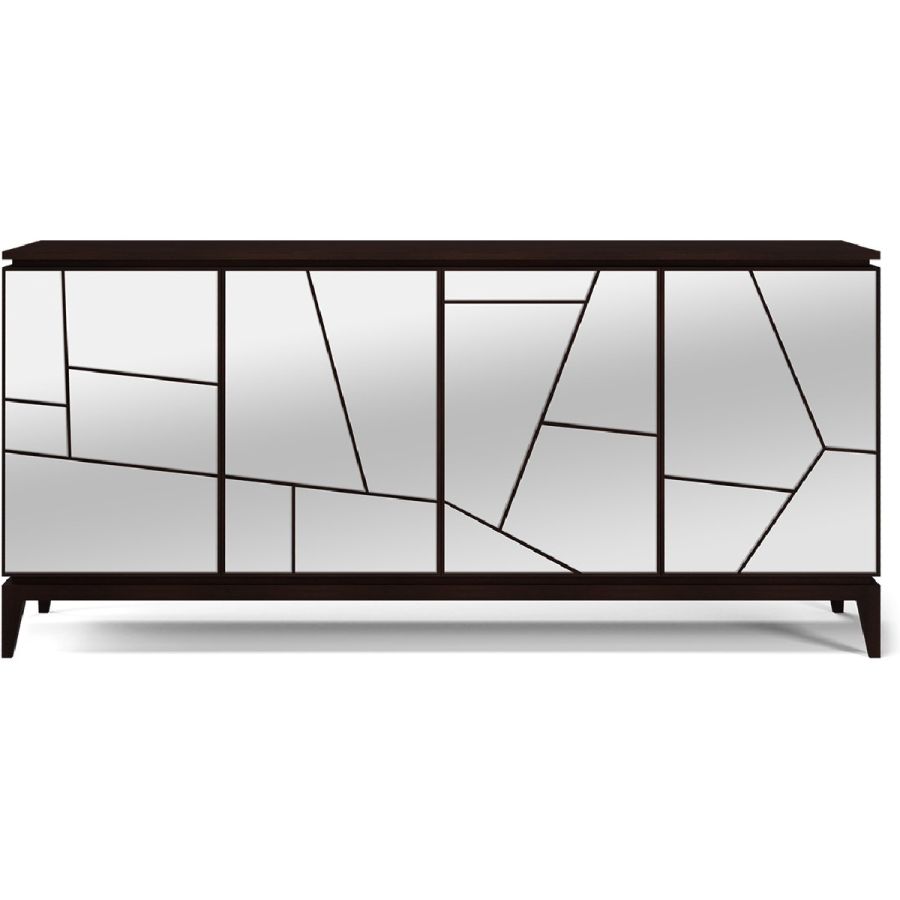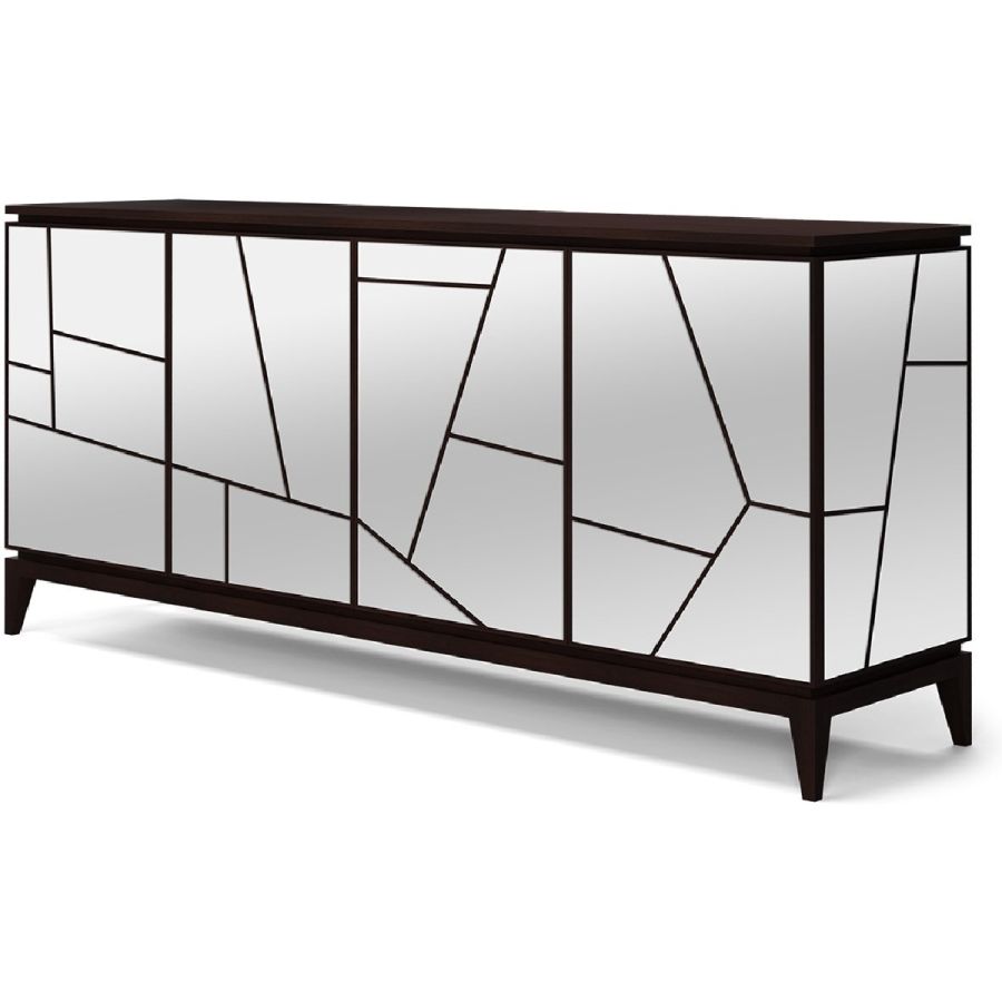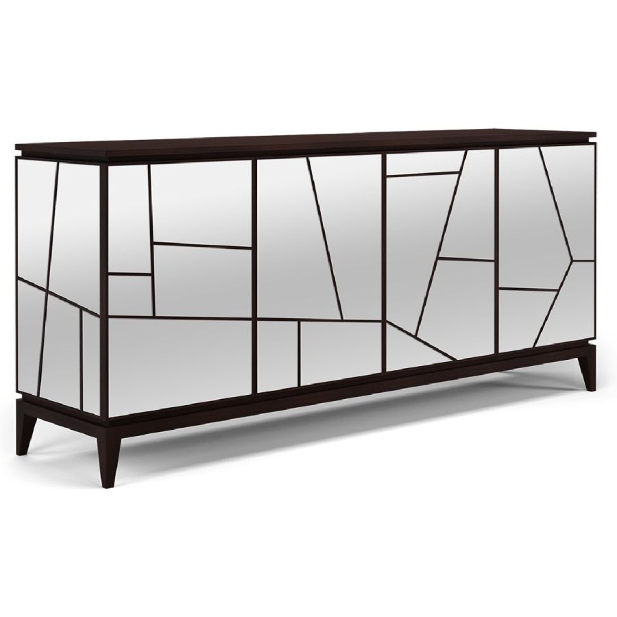 Named after the famous contemporary French architect, this sideboard features four doors, four drawers and eight compartments with adjustable shelves. This striking piece is hand carved in wood on an elegant wood base, and clad in geometric shaped mirror panes. Also available as a nightstand clad in leather panels (84-0061), a nightstand clad in mirror panes (84-0062), and a sideboard clad in leather panels (85-0087).