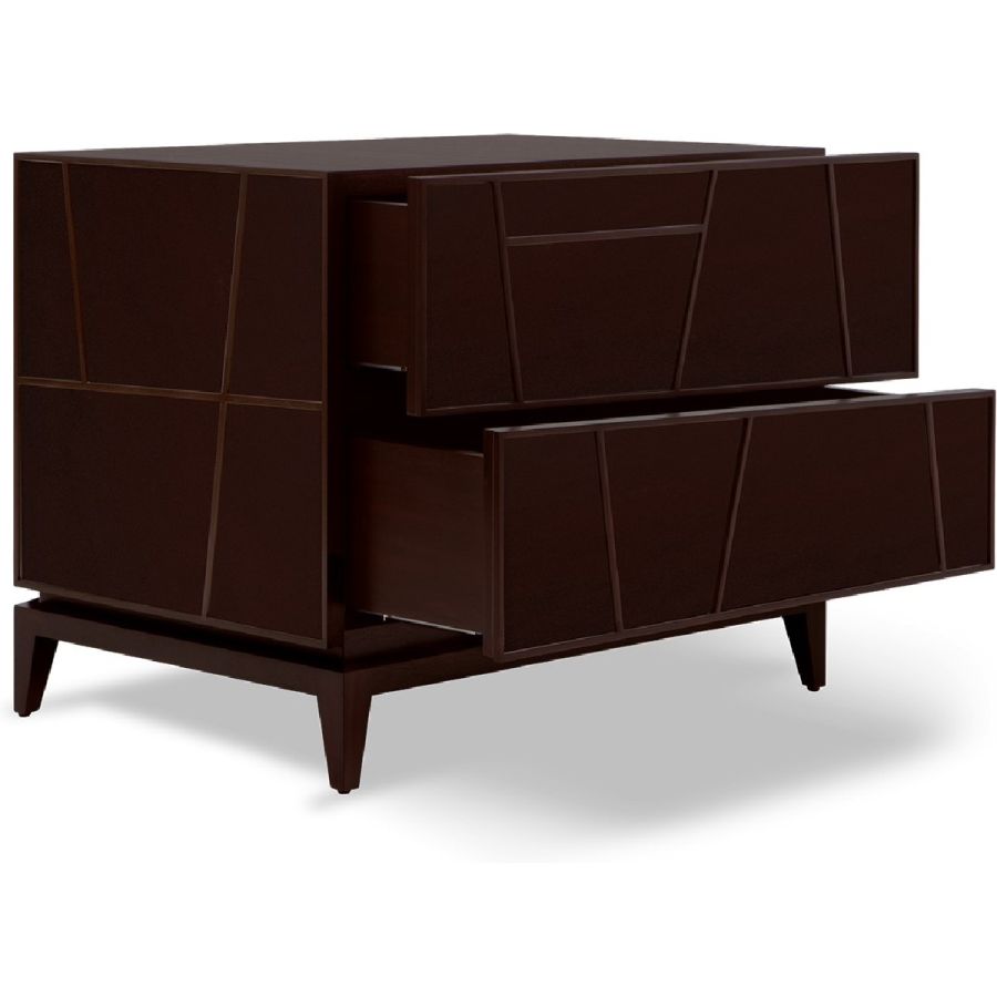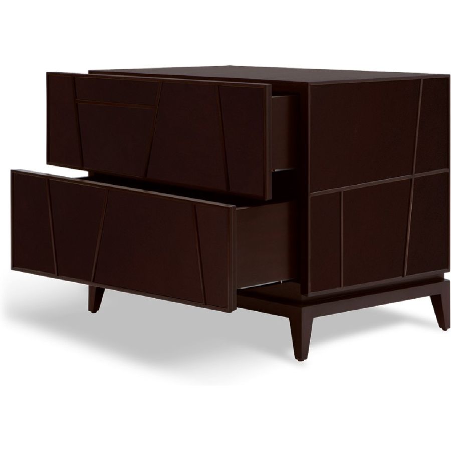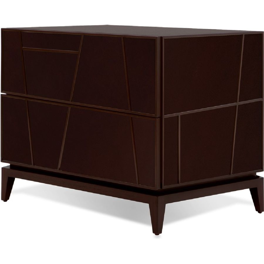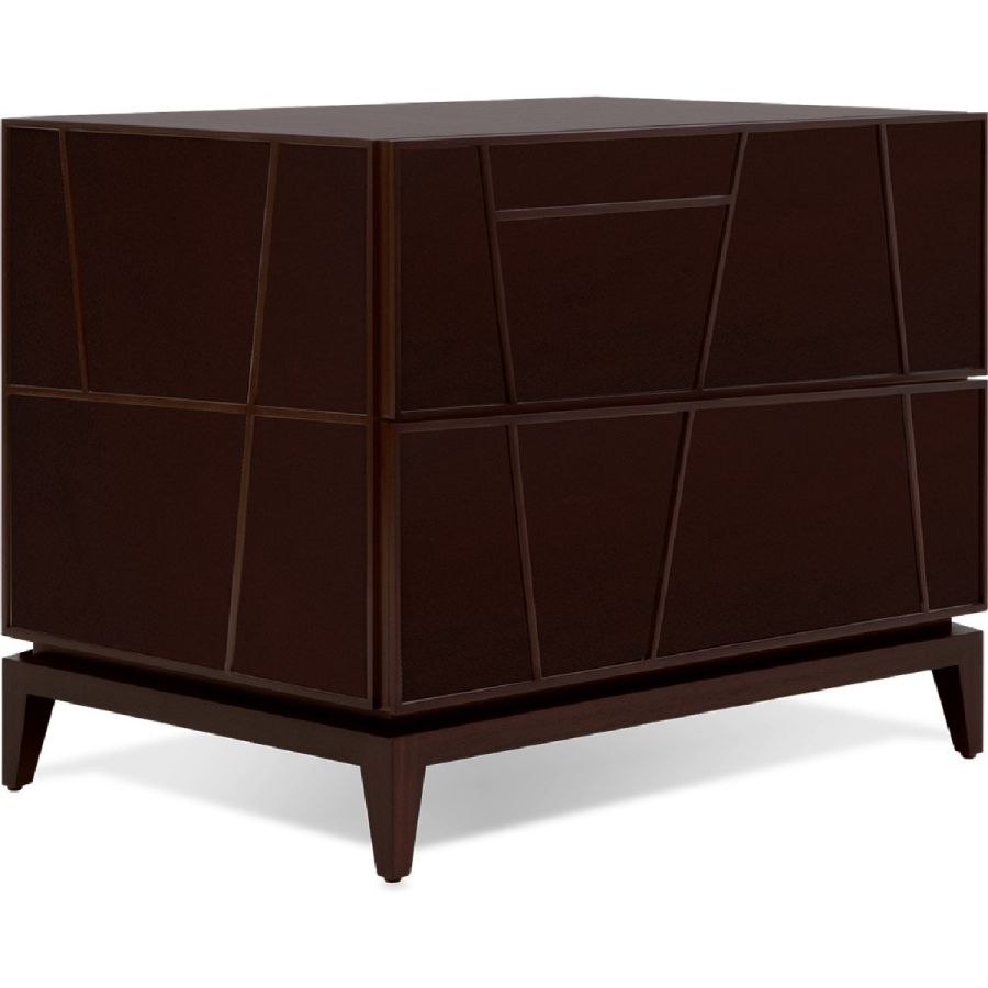 Named after the famous contemporary French architect, a striking nightstand with two drawers, hand carved in wood on an elegant wood base, and clad in geometric shaped leather panels.