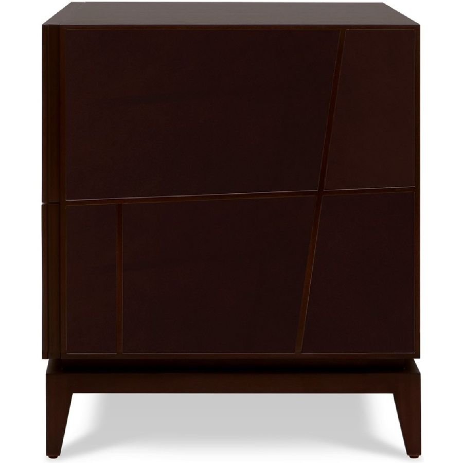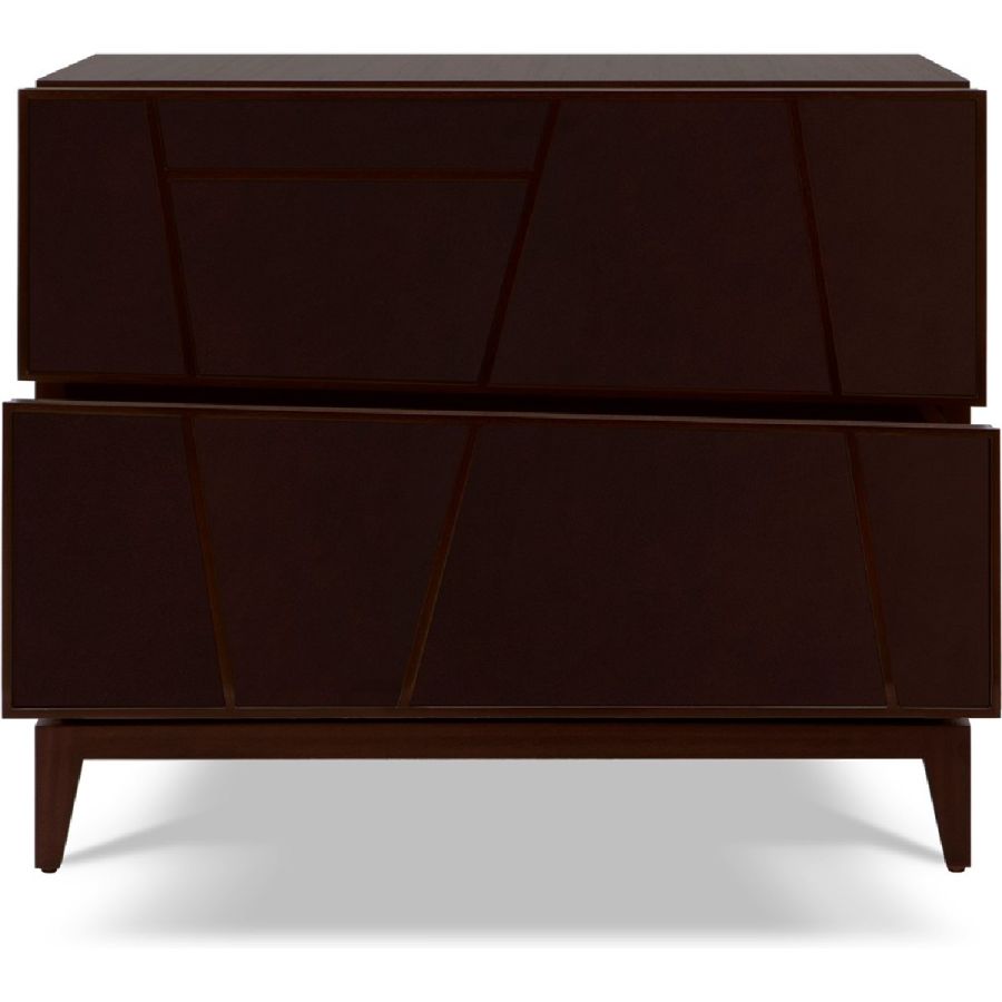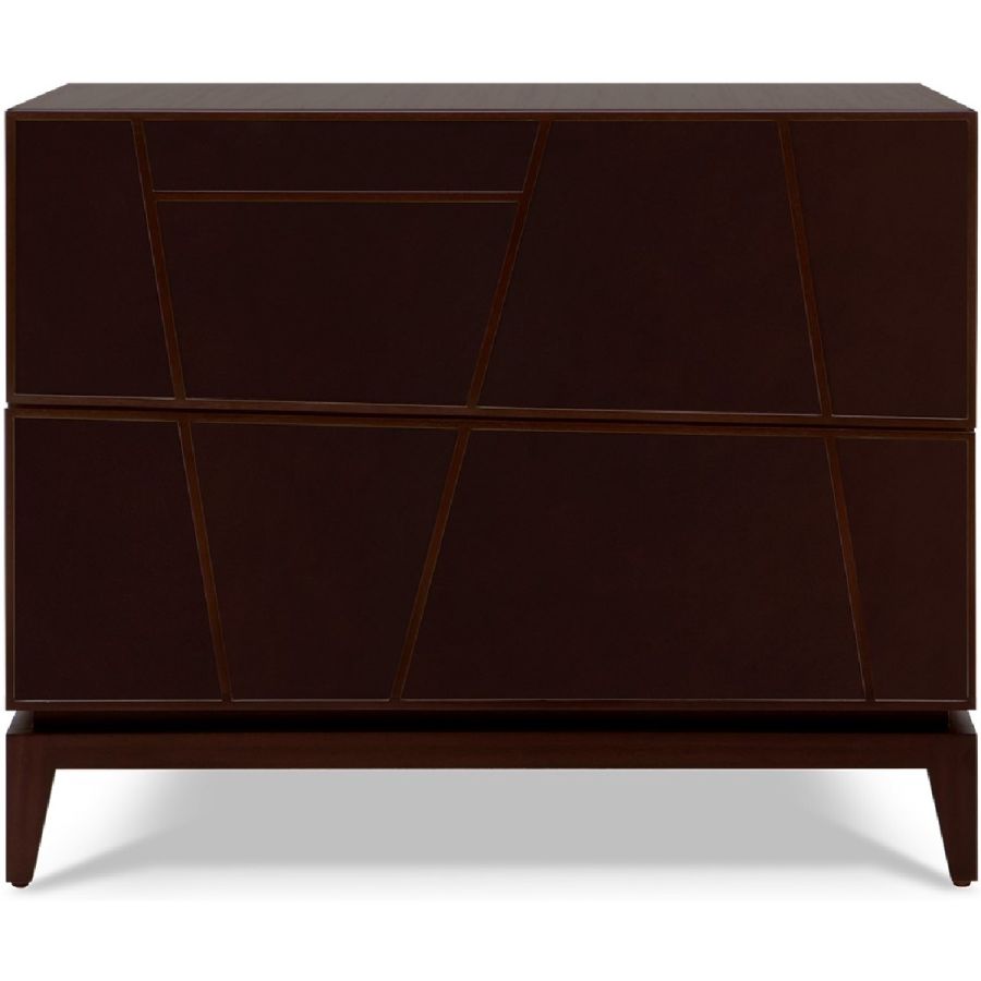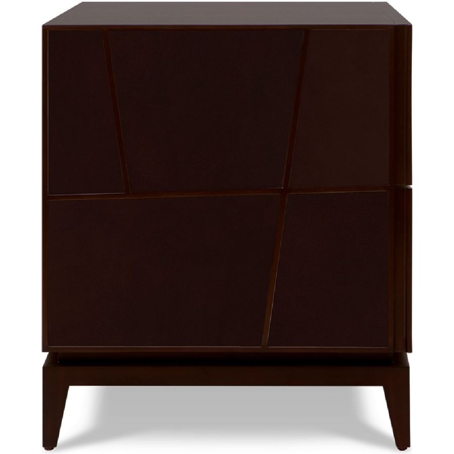 Named after the famous contemporary French architect, a striking nightstand with two drawers, hand carved in wood on an elegant wood base, and clad in geometric shaped leather panels.