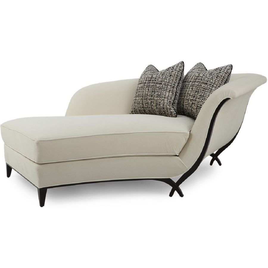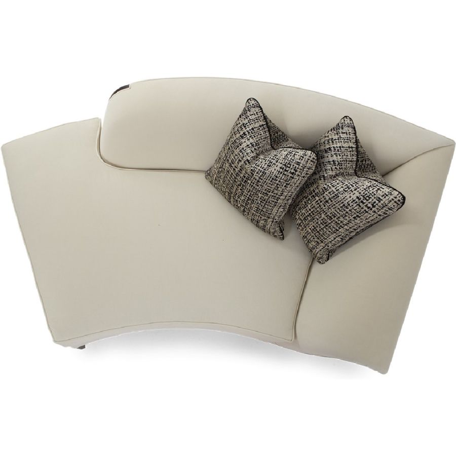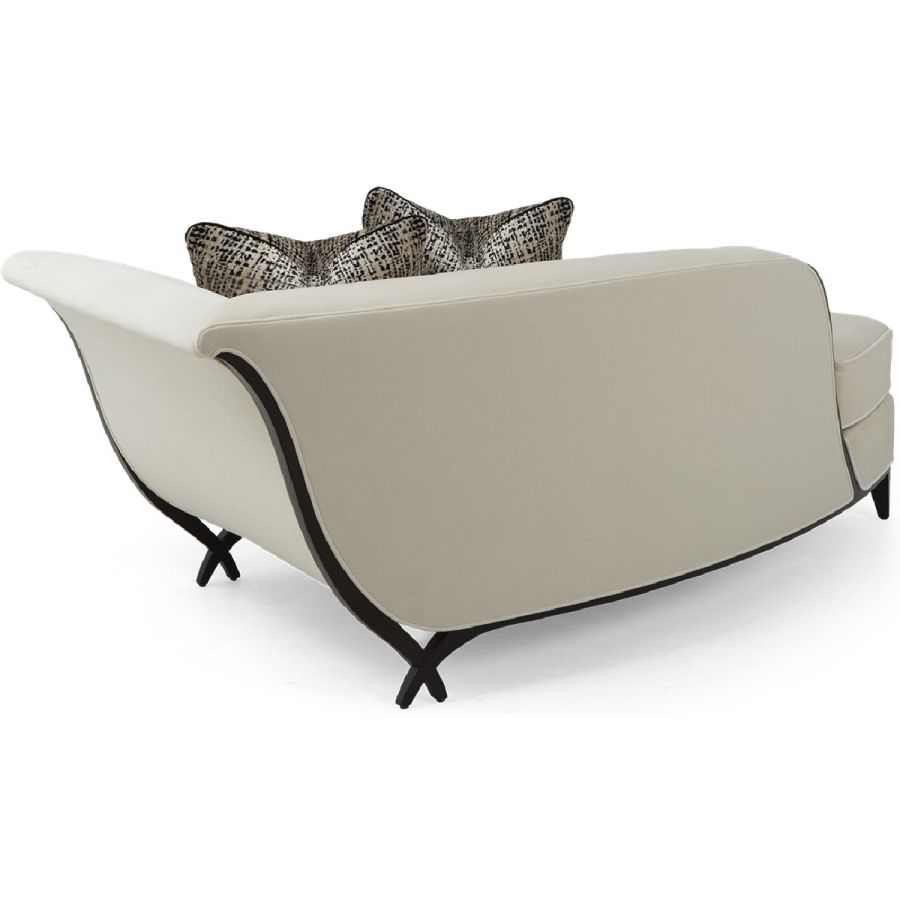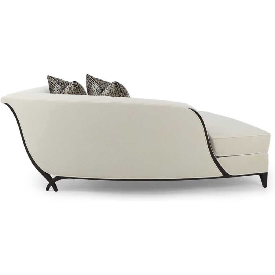 In an unusual sweeping trapezium shape, this is a stunning chaise that combines beauty with comfort. A gently curving back is complemented by a hand-carved frame and the signature Chris-cross legs. Also available in a left hand version (60-0577).