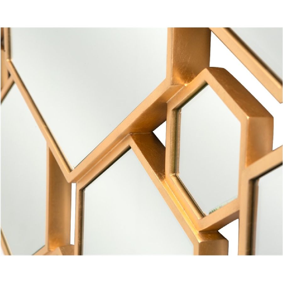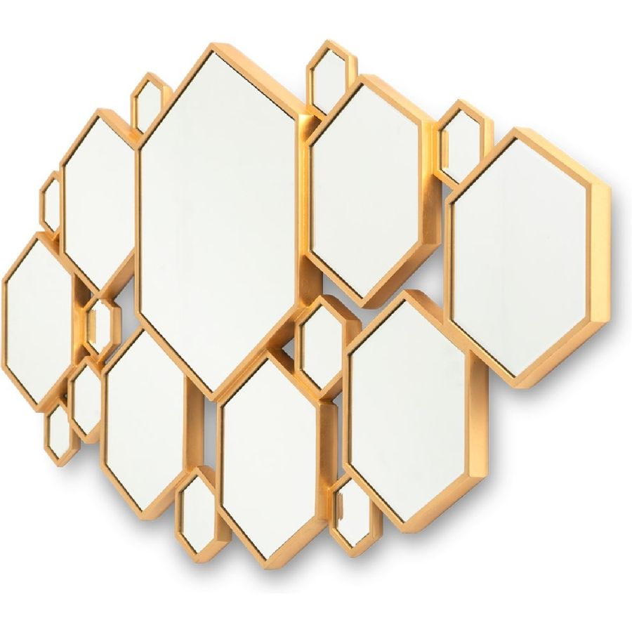 Dramatic and hypnotic, this wide mirror frame is composed of eighteen hexagonal panes of different sizes, set into fine hand crafted wooden frames and brought together to stunning effect. Perfect for an entrance hall, living room or alongside a dining table.