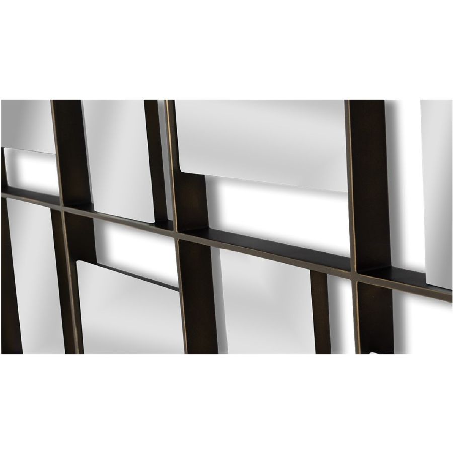 A stunning modular mirror with micro-beveled panes crafted within a worked metal frame. Each module can be duplicated to cover a wall of any size…