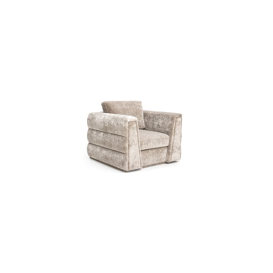 Fixed upholstered armchair with differentiated density polyurethane foam, down filling on the backrest, and seat cushions with removable covers.