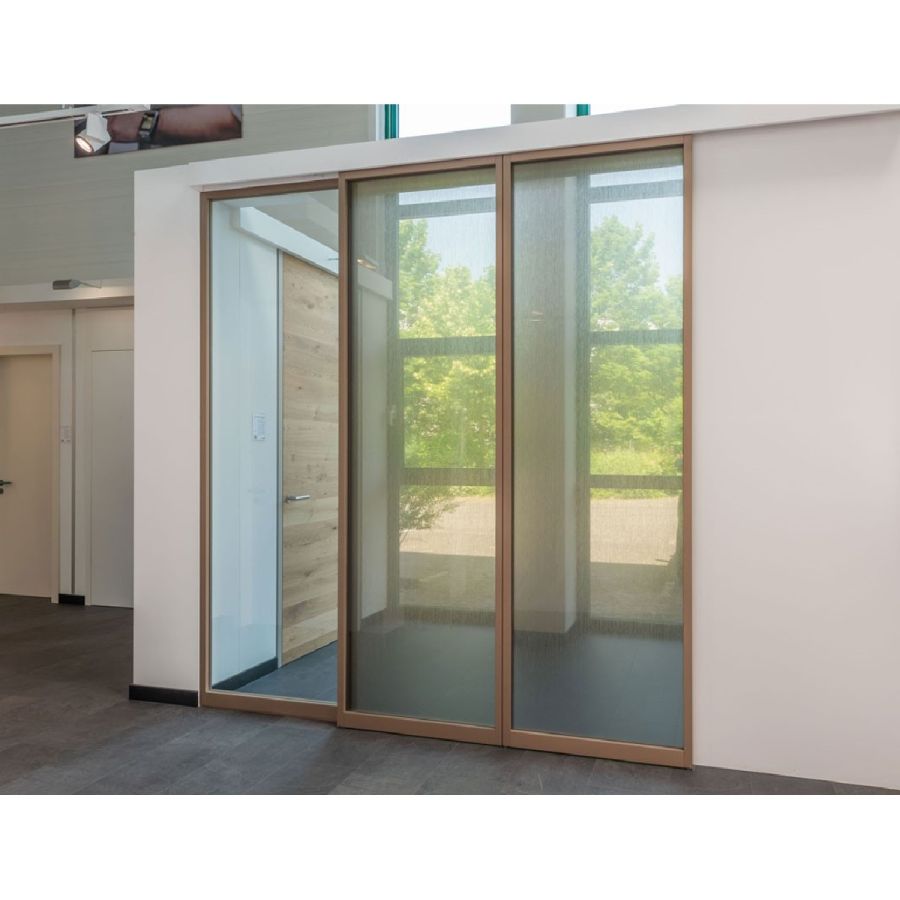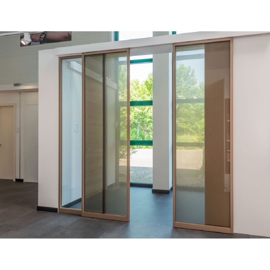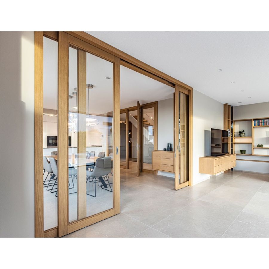 Individual sliding glass door with wooden frame, matching your interior concept.