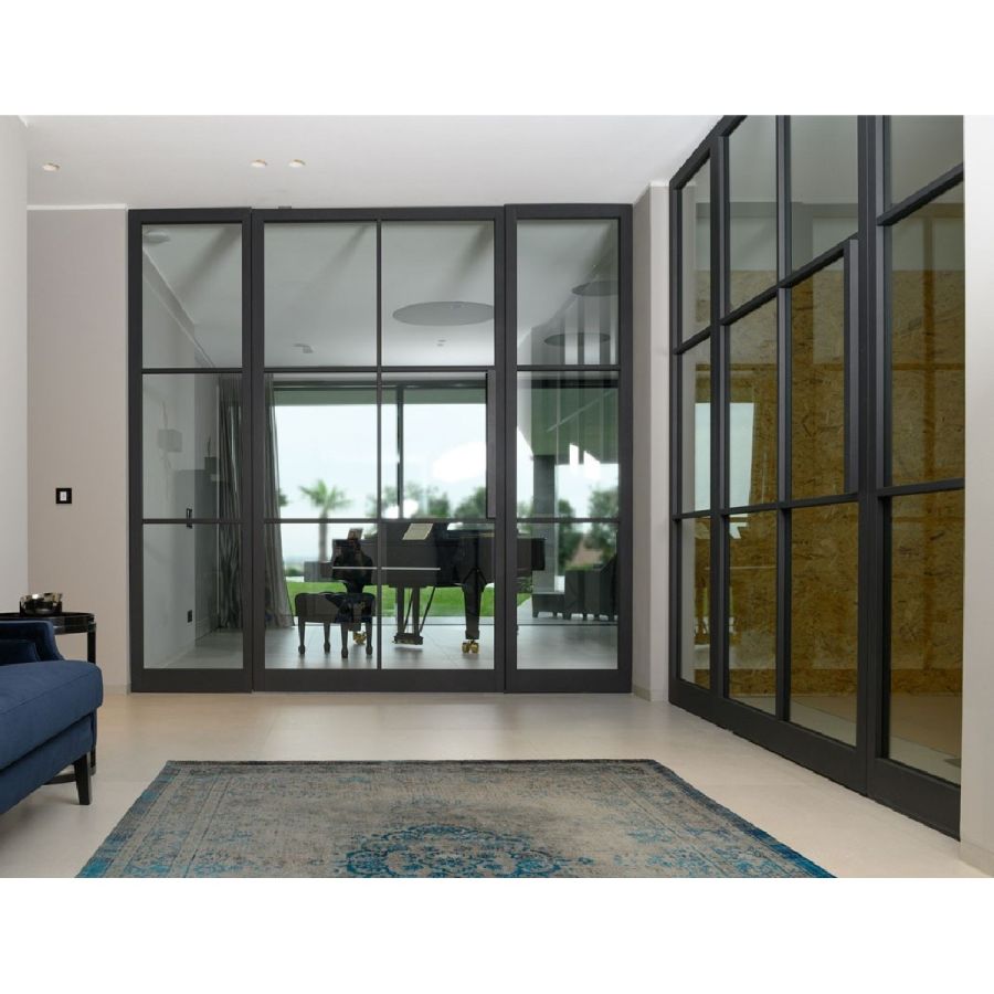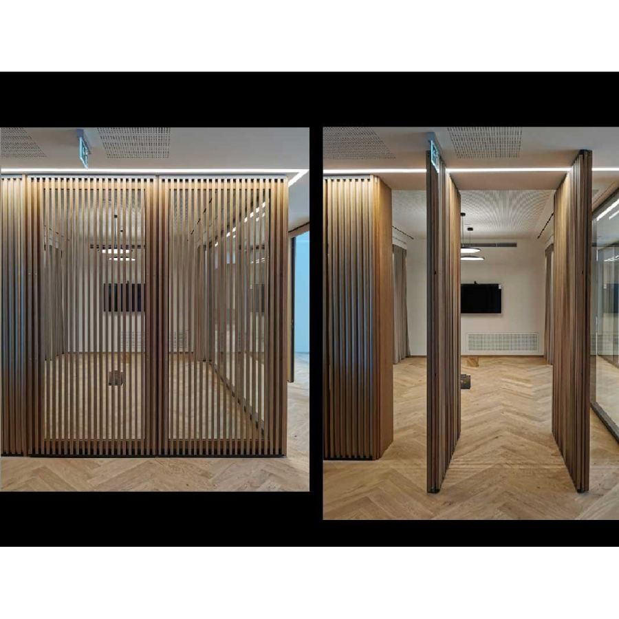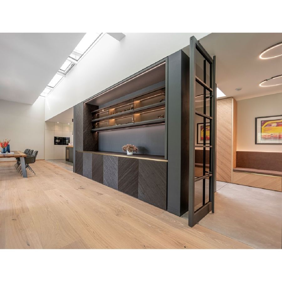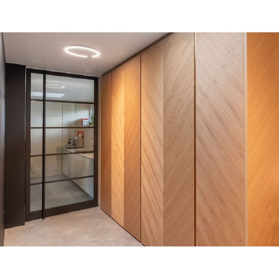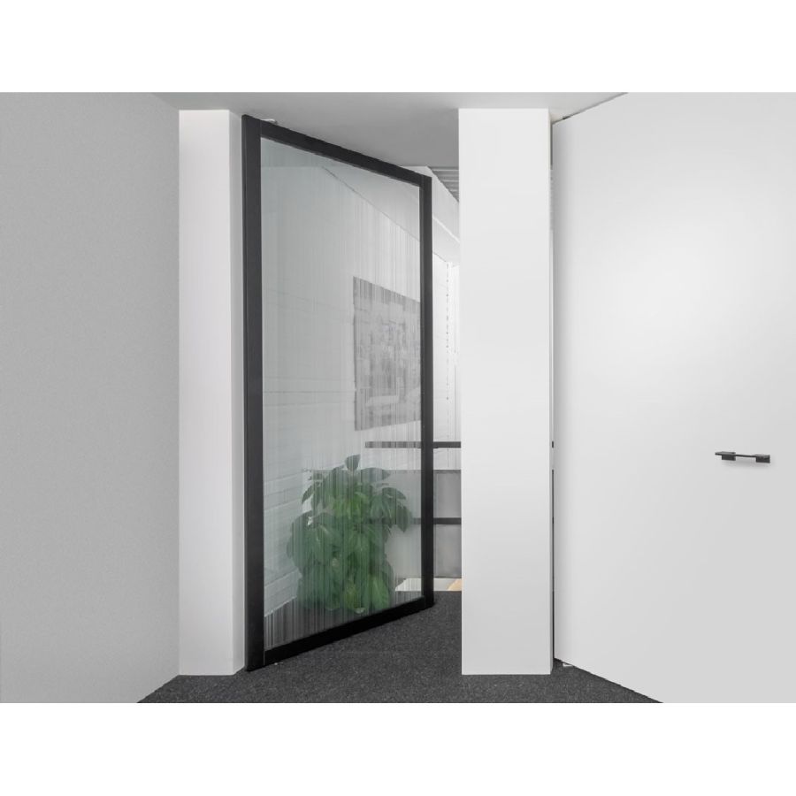 The arrangement and division of the glass strips and the surface of the wooden frame offer you individualisation options, whether in black steel look, with effect lacquer or as a natural wooden surface to match the floor.You can design (have designed) a Pivot glass door whose functionality and effect adapt to the spatial expression you desire.