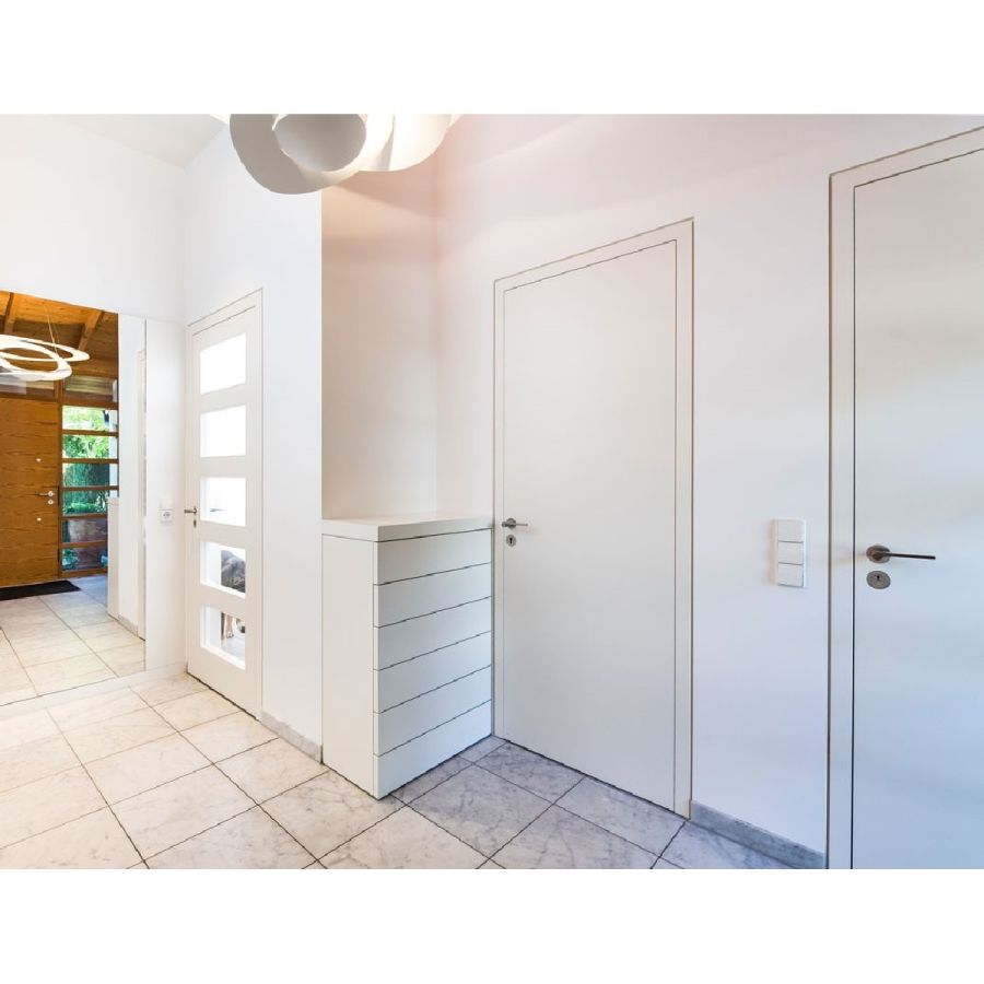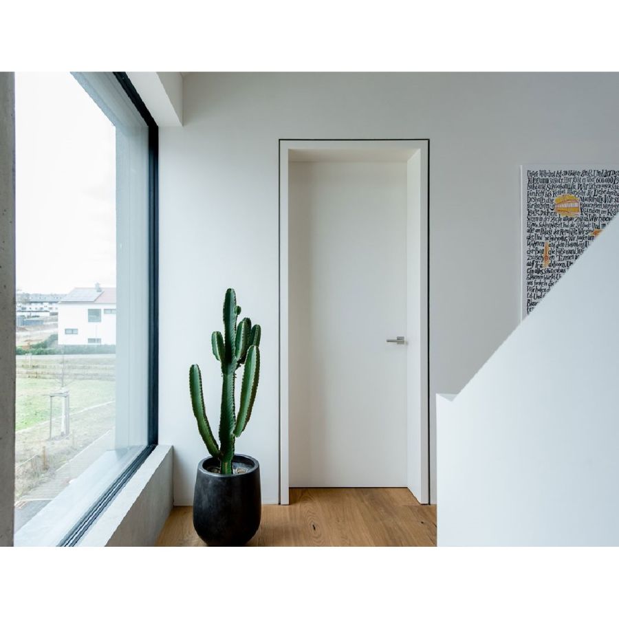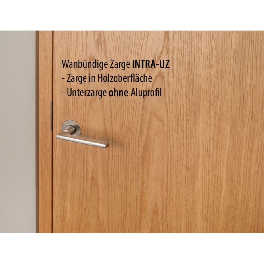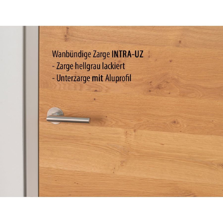 The wall-flush INTRA UZ door forms a flush unit of door, frame and wall by using the bottom frame and shadow gap. Depending on the installation situation, a distinction is made between the variant with aluminium profile (UZ-ALU) suitable for plastering and without (installation in plastered reveal).