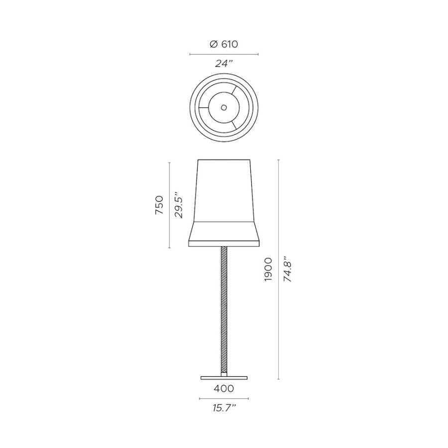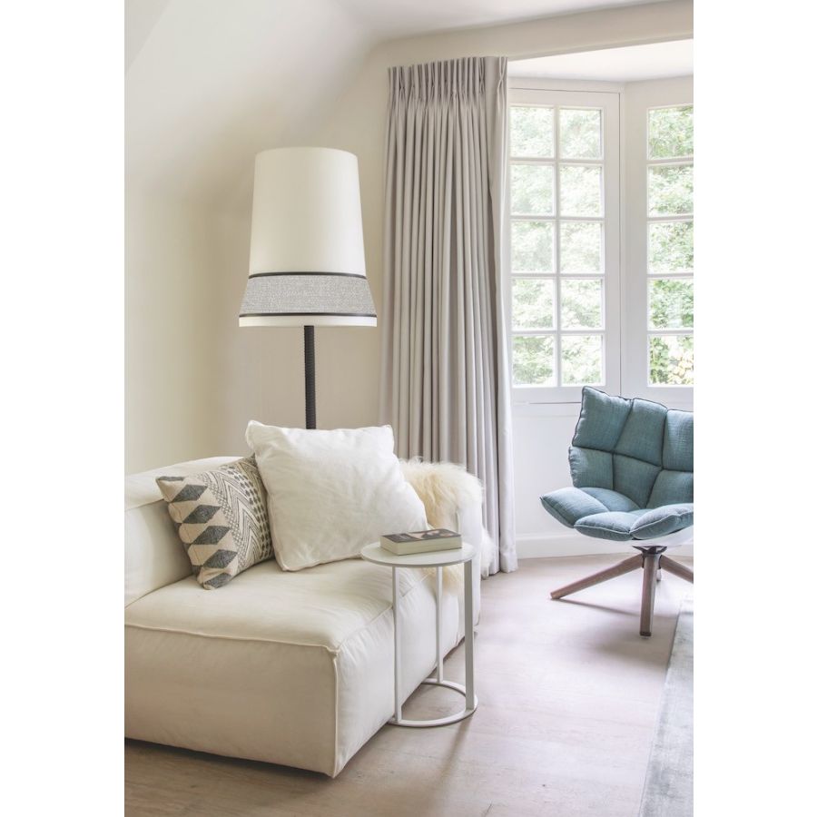 Iconic product inspired by the famous hat worn by Audrey Hepburn in the movie 'Breakfast at Tiffany's'. Designed for exclusive and elegant locations such as lobbies, boutiques, clubs, restaurants and also for classy residential environments. Audrey collection, composed by two table versions, the floor and the suspension versions, is designed as a true style exercise. There are three shades that join together: the cotton on the upper and lower part, san colour bouclé fabric on the central part and the new velvet trimmings, available in different colours. The stem is covered with a braided silk cord.