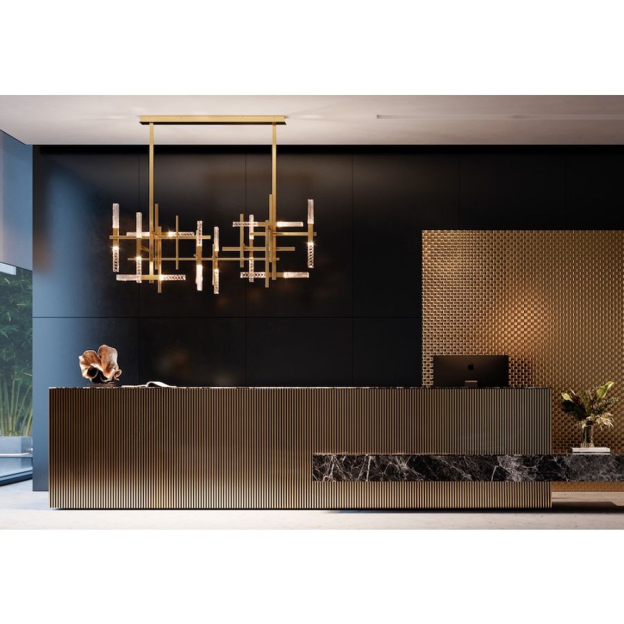 A collection of “jewel” lamps characterised by the combination of rectangular brass tubes and slanted cubes in engraved crystal, with two types of workmanship. The apparently random juxtaposition (hence the name “Mikado”) in fact follow a precise and balanced scheme. The LED sources, inserted in the tubes so as to showcase the preciousness of the crystal, make Mikado a high-performance decorative product that is compatible with home automation systems.