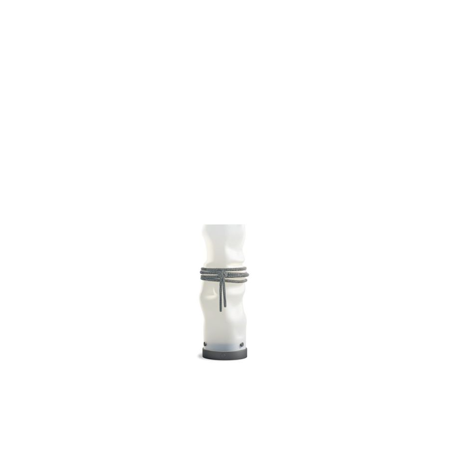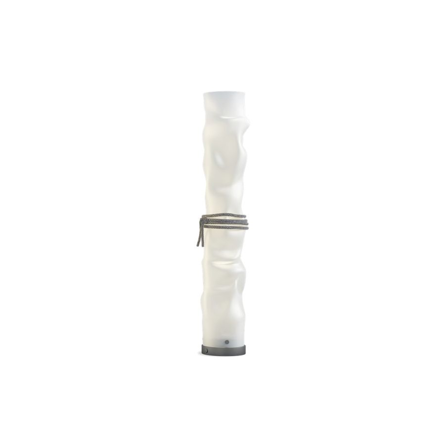 The Baggy table lamp (small and medium) has a double-satin polycarbonate diffuser with the irregular appearance of a crumpled paper tube, while the base is in grey finish. The distinctive soft textile cord in white/grey – a detail that expresses the brand’s archi-decorative stylistic code – becomes a joining element for the table and floor variants adn supports the lamp in the suspended version. The product is available in two heights: 30 and 60 cm.