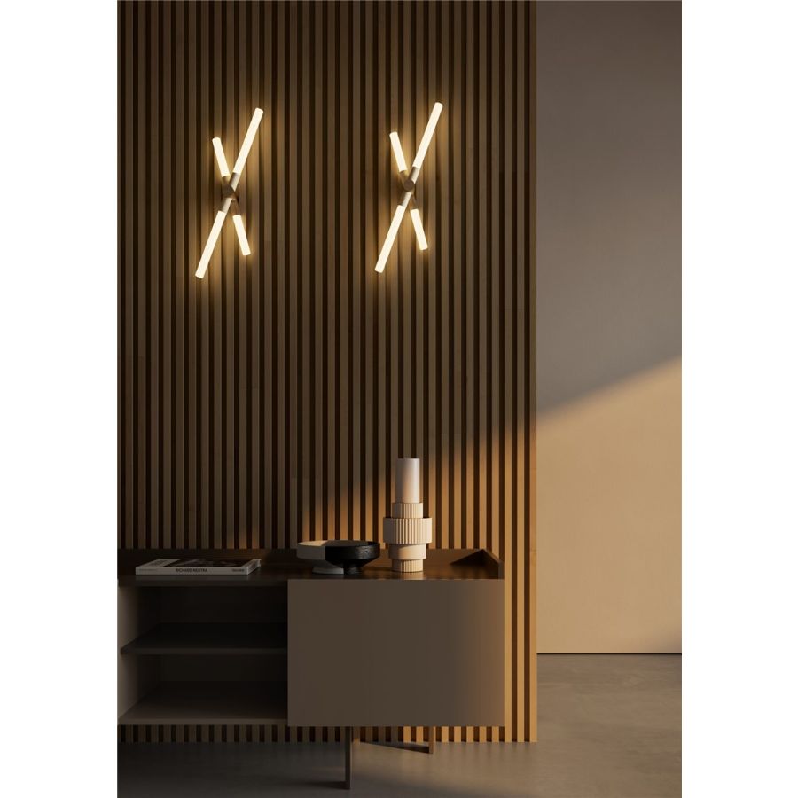 The tubular light sources, crafted from milky white glass in three different sizes, have been specially designed by Contardi, featuring a low-voltage E14 socket (24V).