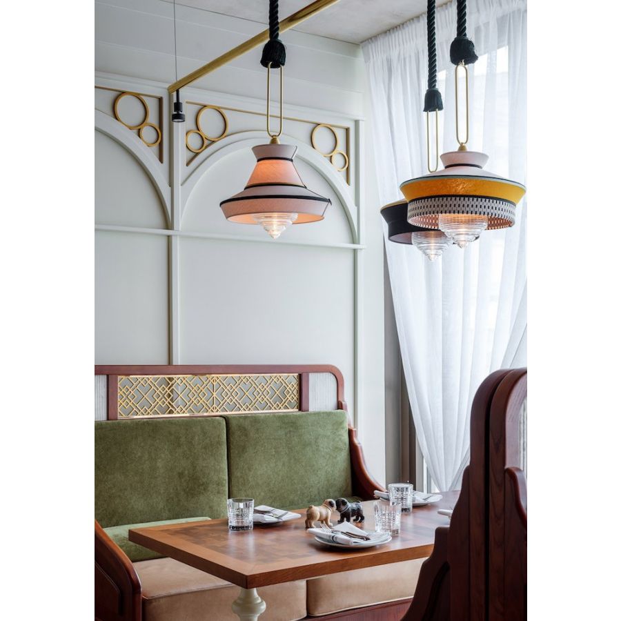 Calypso is a collection of suspension lights inspired by the art deco period, with fabrics whose textures and geometric patterns in black and white mixed with bright colours inspired by the South American and tropical culture, proves a very original result. The indoor version is characterized by a green braided silk cord. The support is a satin brass ring. The diffuser is in transparent glass.