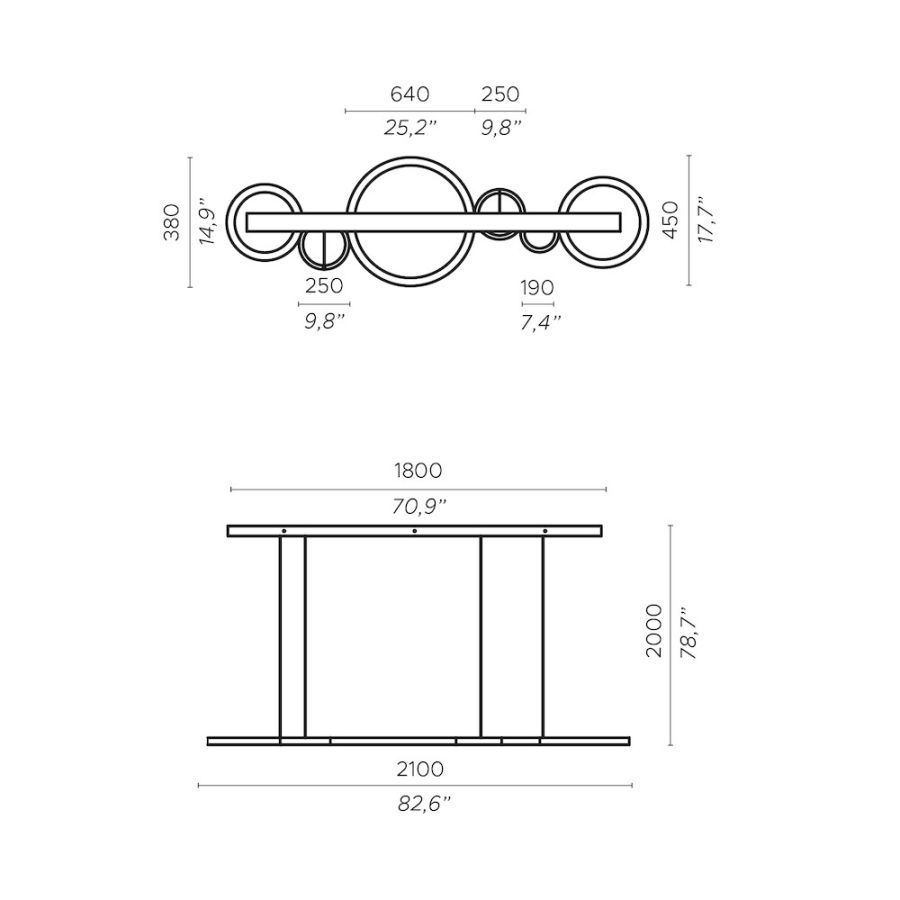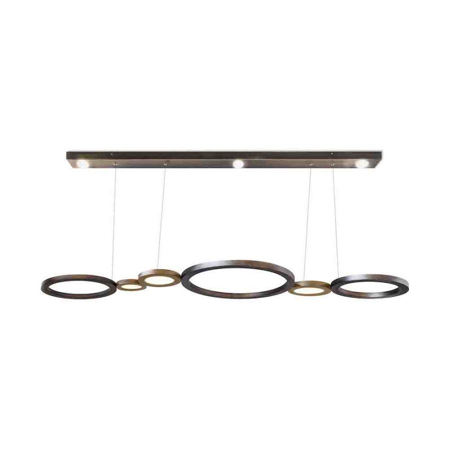 This is a suspension lamp that uses rings, made of wood with a bronze finish (in two colour shades), achieved through new techniques of painting with metal powders: the effect is satin bronze on metal. Contardi presents a dimmable main light, which is inserted in the rosette and centred on the open rings. The closed rings, in alternation, emit a softer and more delicate light, diffused by a special plastic material with veins, which resembles marble. The two light sources can be controlled separately, and the current is carried by coaxial cables, without any power cable, to guarantee the cleanest formal lines.